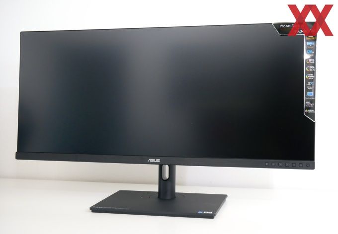 Wie bei allen Pro-Art-Displays geht ASUS auch bei seinem neuen 34-Zoll-Modell schlicht ans Werk. Einen Eye-Catcher gibt es nicht, dafür eine zeitlos schlichte Optik. Das Panel steckt hinter einer Edge-to-Edge-Abdeckung, die dafür sorgt, dass der Rahmen an drei Seiten sehr schmal ausfällt. Real liegt er bei rund 8 mm, sodass es bei einem extrabreiten Multi-Monitor-Setup keine Probleme gibt.