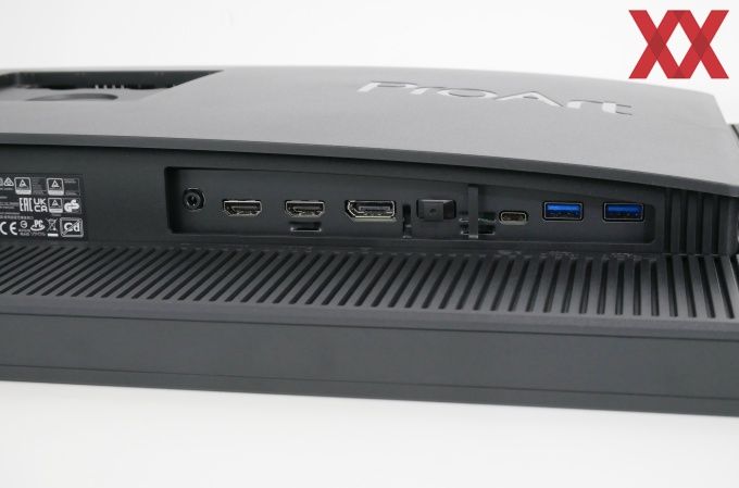 Das eigentliche Anschlusspanel verbaut ASUS gewinkelt, was eine etwas unauffälligere Kabelführung möglich macht, als es beispielsweise bei LG-Geräten möglich ist.