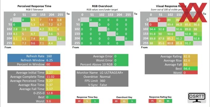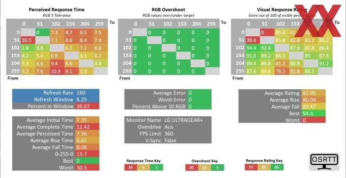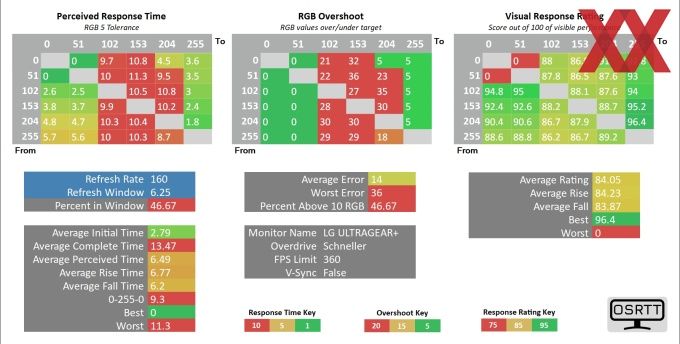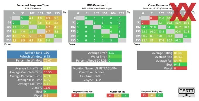 Die Messungen setzen sich aus drei Abschnitten zusammen. Einerseits der Messung der Reaktionszeit (siehe Display FAQ), der Messung des RGB-Overshoots und schlussendlich dem Visual Response Ratings. Für die Beurteilung der Reaktionszeit ziehen wir ganz klassisch die Average Initial Time heran. Diese misst die Zeit, bevor das Overshooting stattfindet. Das Overshooting misst die RGB-Werte, die ein Pixel überschwingt. Letzteres Rating soll darstellen, wie lange es dauert, bis die Ausgangsfarben nicht mehr dargestellt werden - es geht also darum, wie schnell die Veränderung dargestellt werden kann. Das Ergebnis in einem 100er-Rating angegeben, 100 wäre also der Optimalwert.