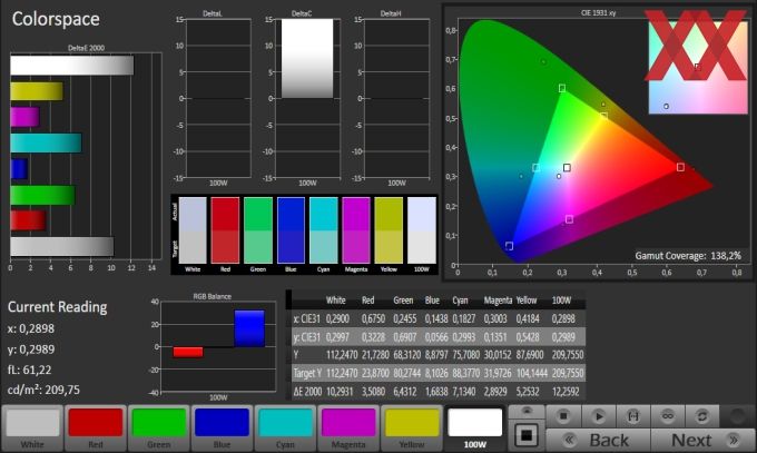 Auch hier gilt analog zum großen 45-Zöller: Warum nicht gleich so. Der Weißpunkt liegt nun bei fast idealen 6.421 K, so müssen nur noch Profis nachregeln. Auch das Graustufen-Delta ist mit 2,3 nun auf einem deutlich besseren Niveau. Gleiches gilt für den ColorChecker-Test, der ein gemitteltes DeltaE von 2,2 und ein Maximum von 4,2 ausgibt.