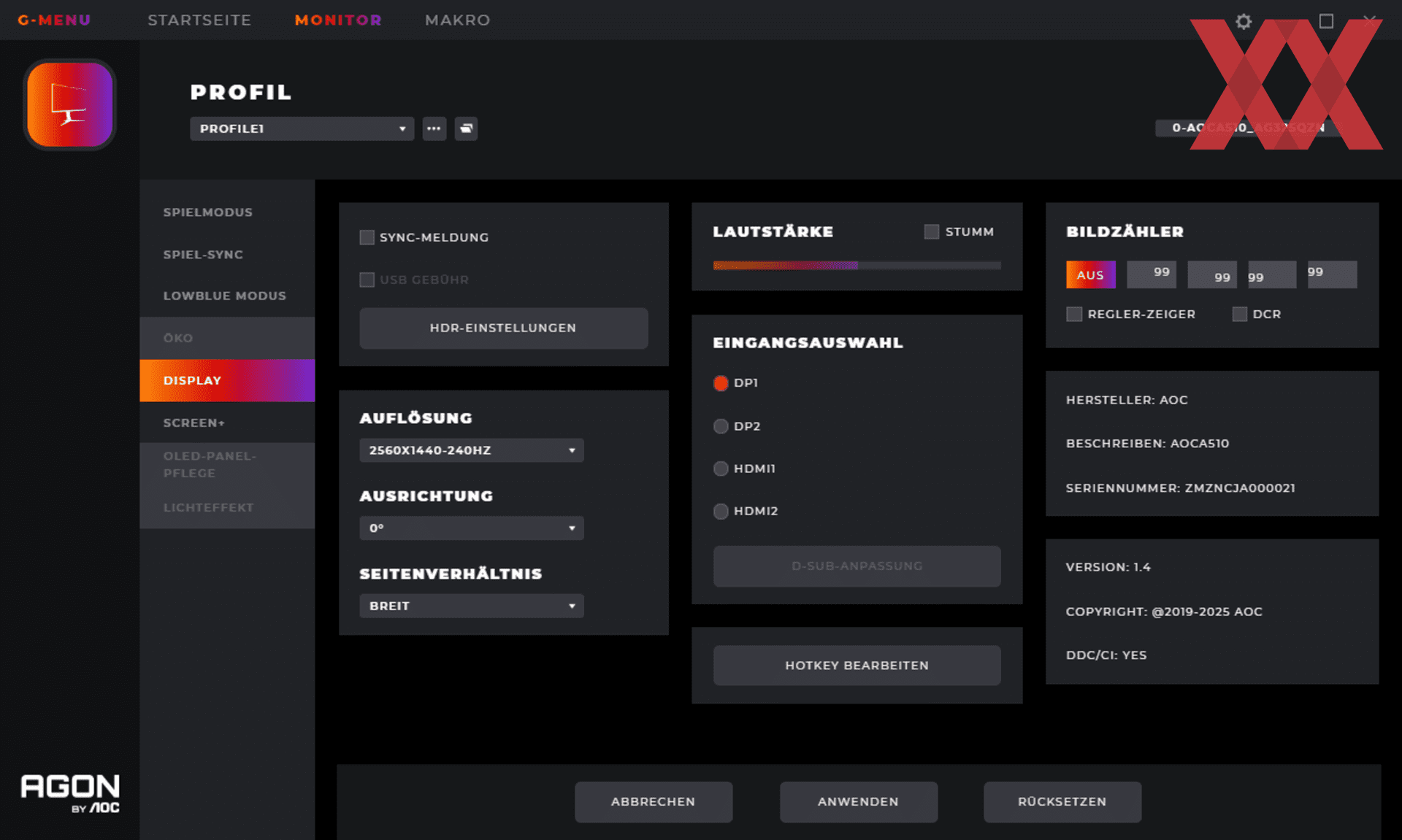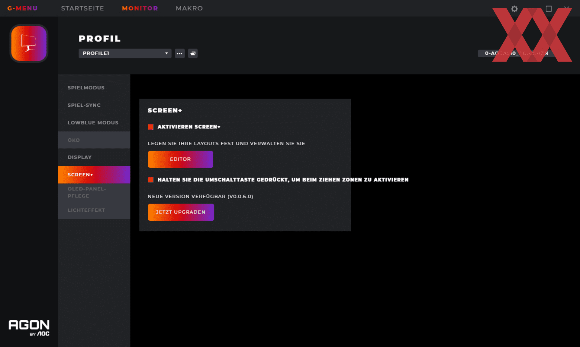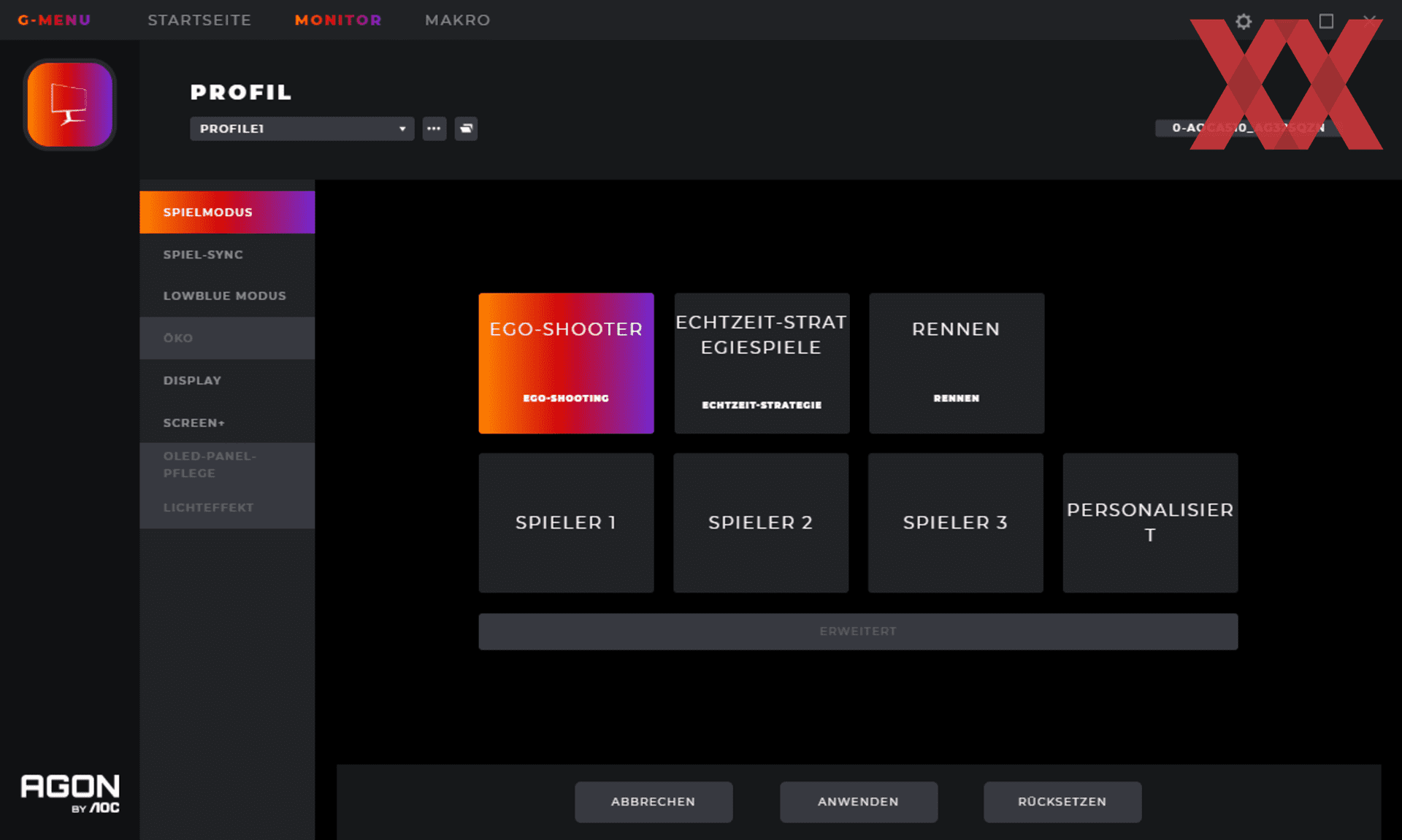 AOC bildet den Funktionsumfang des OSD nach und erlaubt darüber weitere Funktionen, wie die Möglichkeit Profile anzulegen, oder ein Preset automatisch beim Start einer Anwendung laden zu lassen. Gerade letzteres ist ein Bonus-Feature, an das man sich schnell gewöhnt.