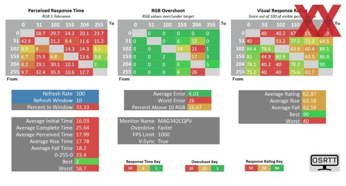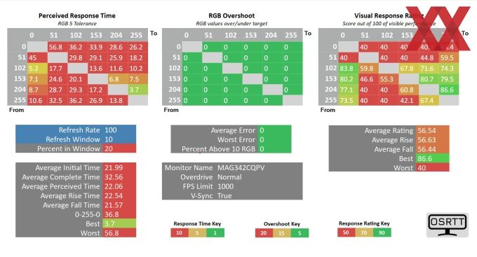 Die Messungen setzen sich aus drei Abschnitten zusammen. Einerseits der Messung der Reaktionszeit (siehe Display-FAQ), der Messung des RGB-Overshoots und schlussendlich dem Visual Response Ratings. Für die Beurteilung der Reaktionszeit ziehen wir ganz klassisch die Average Initial Time heran. Diese misst die Zeit, bevor das Overshooting stattfindet. Das Overshooting misst die RGB-Werte, die ein Pixel überschwingt. Letzteres Rating soll darstellen, wie lange es dauert, bis die Ausgangsfarbe nicht mehr dargestellt werden - es geht also darum, wie schnell die Veränderung dargestellt werden kann. Das Ergebnis in einem 100er-Rating angegeben, 100 wäre also der Optimalwert.
