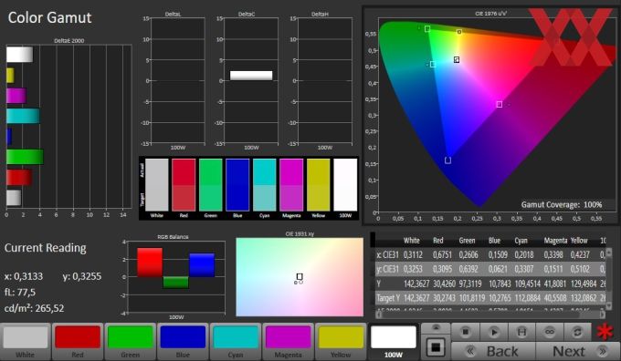 Sehr gut gefällt das Graustufen DeltaE von 2,0. Auch im ColorChecker-Test werden mit einem maximalen DeltaE von 4,71 und einem Durchschnitt von 3,31 überzeugende Werte erreicht. Das DeltaE der Sättigung beträgt 4,45 im Maximum und 2,36 im Mittel.