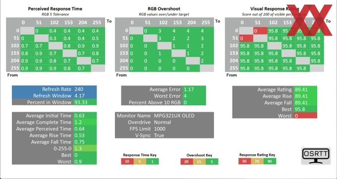 Die Messungen bestätigen nicht nur den exzellenten Bildeindruck beim Spielen, sondern obendrein das Limit unseres Messgeräts. Mit einer Reaktionszeit von 0,62 ms, einem RGB-Overshoot von 1,1 und einem VRR von 89,41 sehen die Ergebnisse exzellent aus, decken sich aber auch weitestgehend mit dem, was wir für den Alienware AW3225QF gemessen haben. Zu viel Wert sollte auf dieses Zahlenspiel daher nicht gelegt werden.