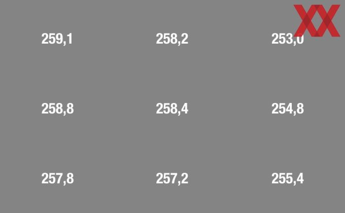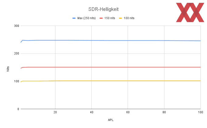 Die maximale Leuchtkraft im SDR-Betrieb liegt bei 259,1 cd/m², während der dunkelste Sektor 253 cd/m² hell ist. Es wird also eine sehr hohe Homogenität von 97,65 % erreicht.