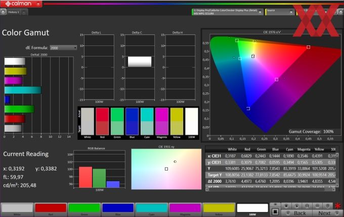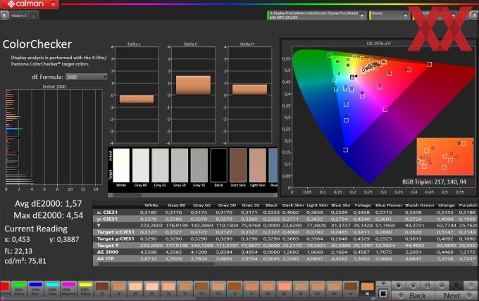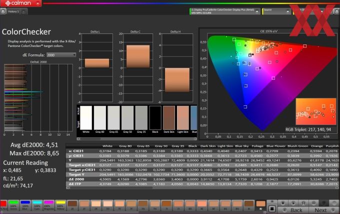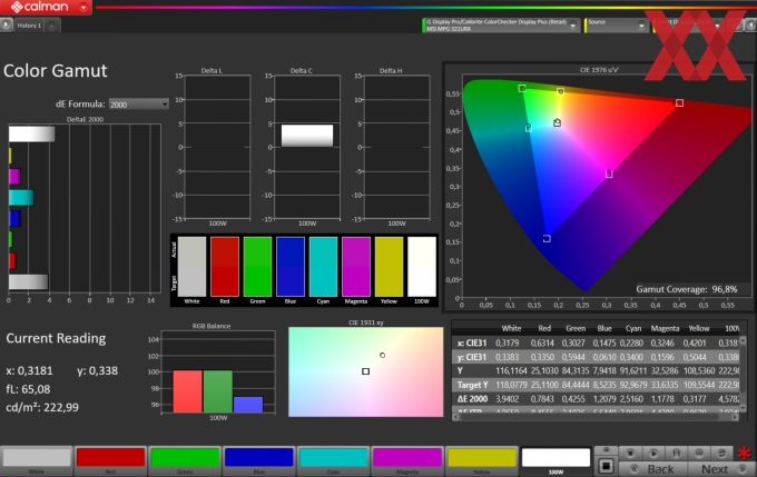 Das Graustufen-DeltaE beträgt in diesem Setting 3,1, während im ColorChecker-Test mit einem Mittelwert von 1,57 und einem maximalen DeltaE von 4,54 deutlich bessere Werte erreicht werden. Das gilt auch für die Sättigung. Hier beträgt das gemittelte DeltaE bei 1,66 und das Maximum bei 4,66.