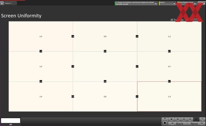 Die Farbverteilung über das Panel zeigt sich recht gleichmäßig. Lediglich das obere linke Segment sticht mit einem DeltaE-Wert von 2,4 im Vergleich zum mittleren Segment etwas heraus. Das Ergebnis ist dennoch als sehr gut zu erachten.