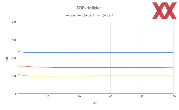 Die SDR-Helligkeit ist in unseren Messungen in allen drei Helligkeitsstufen konstant, was zu einer sehr angenehmen Darstellung - gerade im Desktop-Betrieb - führt. Wie wir zuvor gezeigt haben, gibt es wohl eine Logo-Detection, die aber nur einen minimalen Einfluss auf die Helligkeit hat.