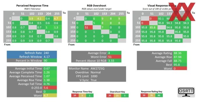 Für die Reaktionszeit messen wir den für OLED-Displays üblichen 0,67 ms, was die Grenze unseres Messgeräts darstellt. Das VRR befindet sich ebenfalls auf dem gewohnt hohen Niveau und landet bei 88,36. Einzig beim RGB-Overshoot gab es einen kleinen Ausreißer, die Grafik zeigt allerdings deutlich, dass es sich hier wohl nur um einen Messfehler handelt. Die Latenzen liegen auf einem normalen Niveau für ein 240-Hz-Gerät.