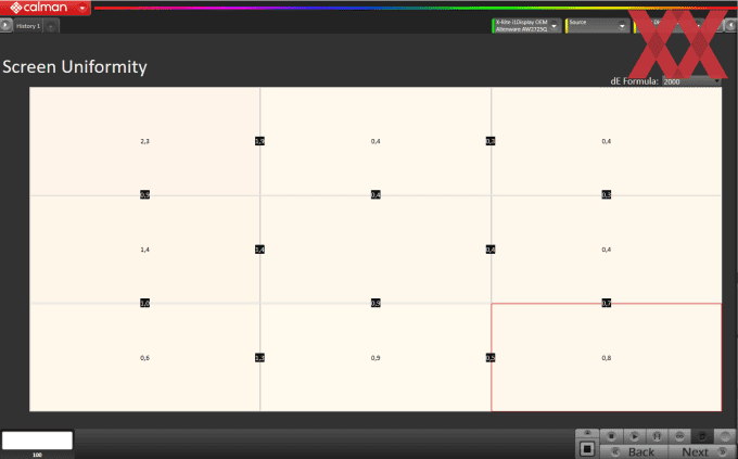 Mit einer maximalen Abweichung von DeltaE 2,3 im oberen linken Quadranten und meist Werte kleiner 1 gibt es wenig zu meckern. Farbunterschiede fallen mit dem bloßen Auge nicht auf.