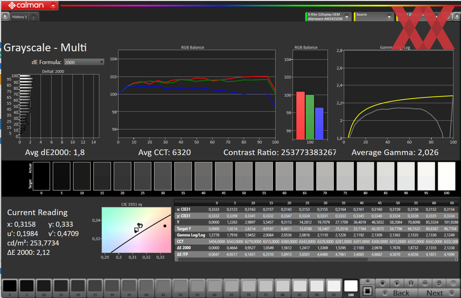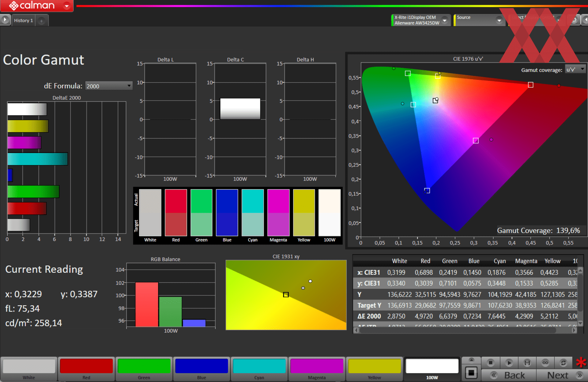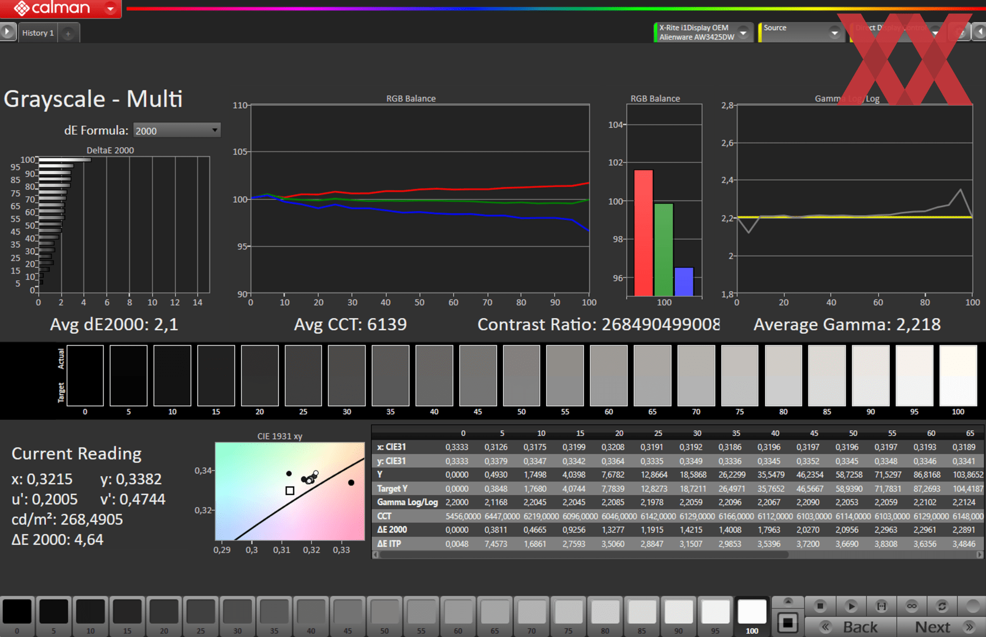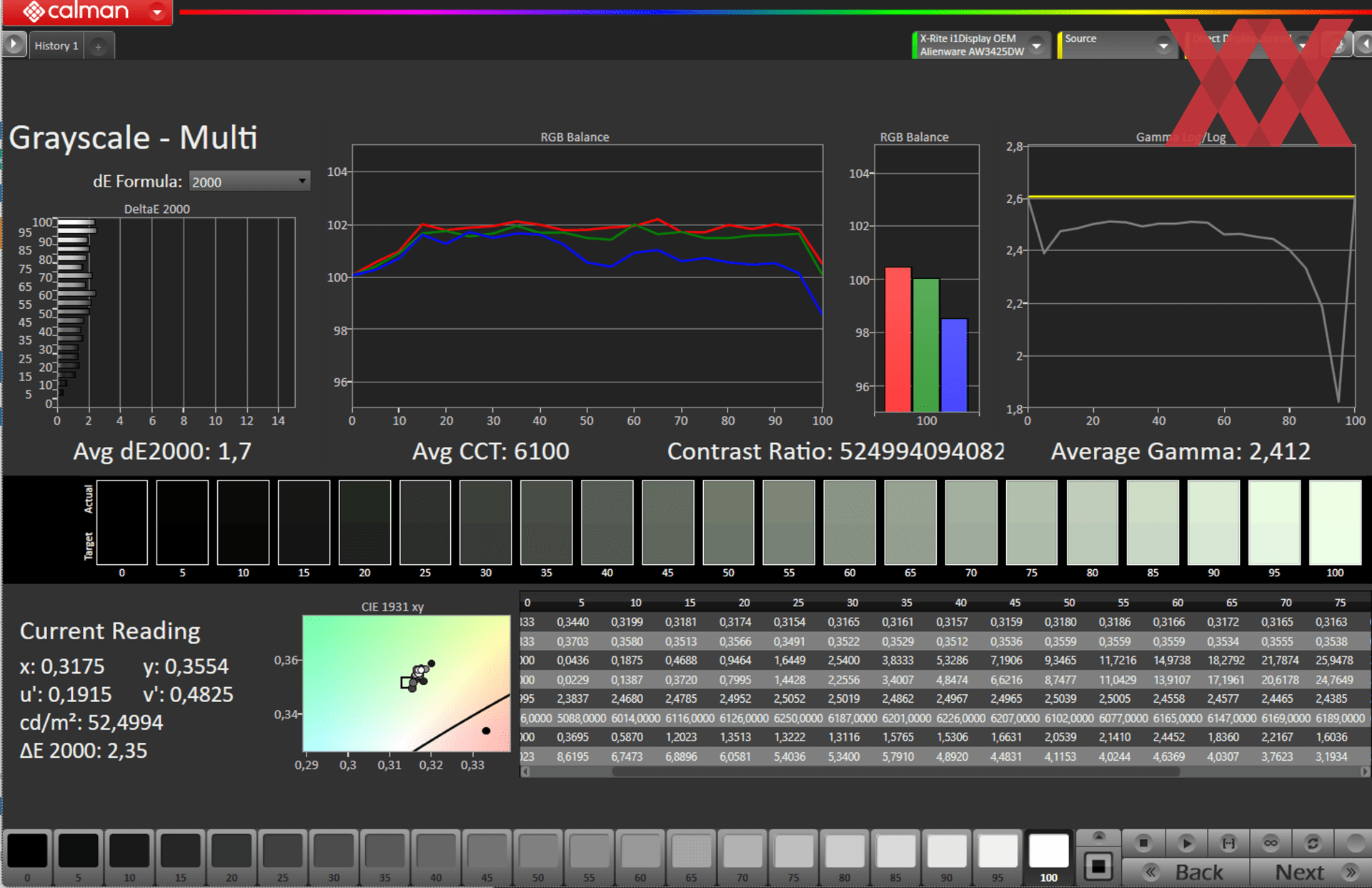 Der Weißpunkt fällt mit 6.139 K etwas zu warm aus, so wie wir es schon bei vielen QD-OLED-Geräten gesehen haben. Die RGB-Balance zeigt gut, dass der Rot-Anteil über den gesamten IRE-Bereich etwas zu hoch ist.