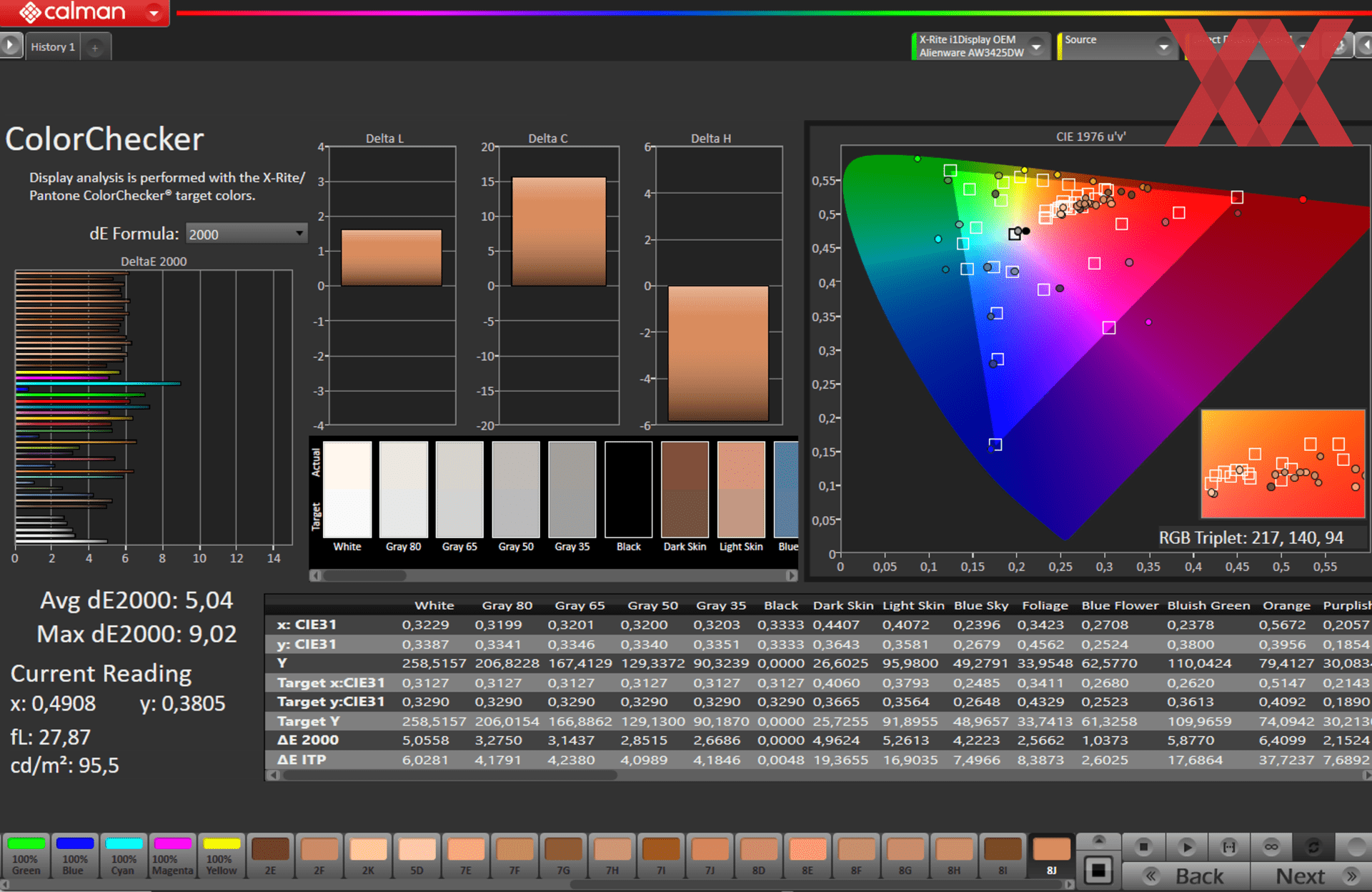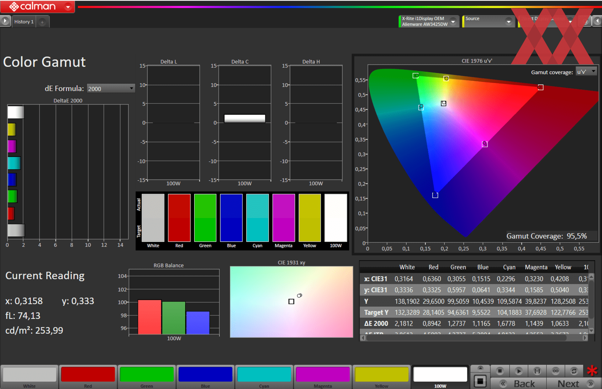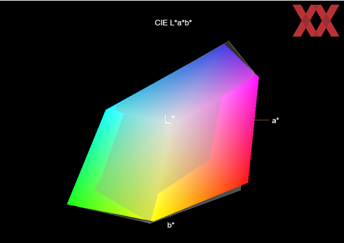 Für den Weißpunkt messen wir 6.320 K, wir bewegen uns also in die richte Richtung, insgesamt ist die Darstellung aber noch immer etwas zu warm. Die Abdeckung des sRGB-Frabraums beträgt nur 95,5 %. Mit einer etwas präziseren Abstimmung der Eck-Koordinaten wäre eine vollständige Abdeckung bei diesem Panel problemlos drin gewesen.