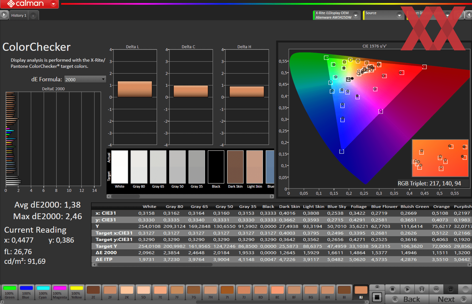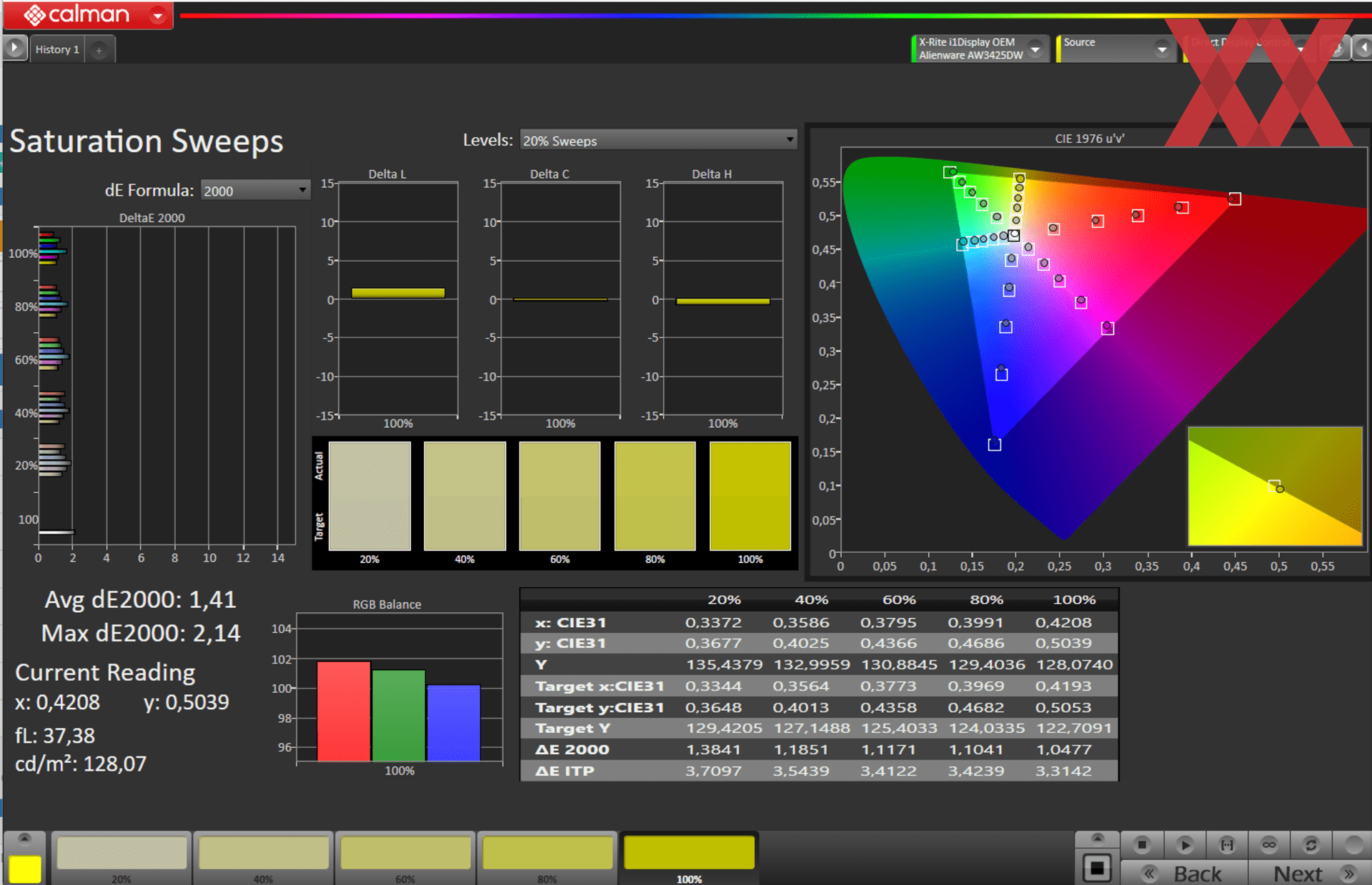 Das Graustufen-DeltaE fällt dafür mit 1,7 recht gut aus. Das gilt auch für den Color-Checker-Test mit einem gemittelten DeltaE von nur 1,51 und einem Maximum von 2,86. Das gilt so auch für die Sättigung mit einem gemittelten DeltaE von 1,39 und einem Maximum von 2,47.