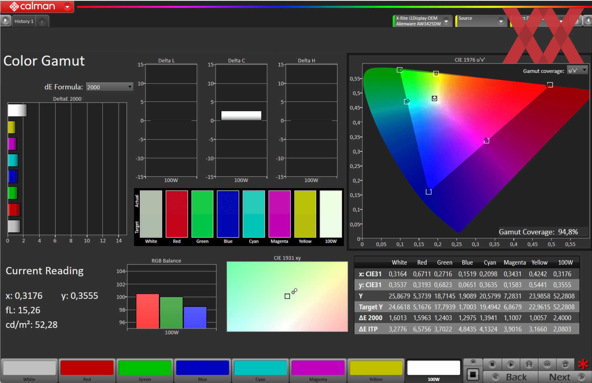 Der DCI-P3-Farbraum wird in diesem Setting zu 94,8 % abgedeckt. Mit Blick auf das, was das Panel kann, gibt es also auch hier noch Luft nach oben.