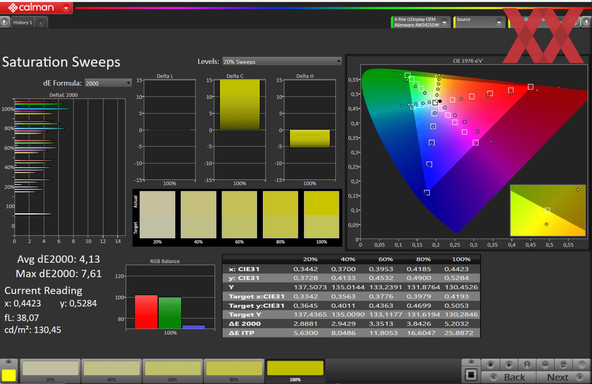 Der Weißpunkt beträgt 6.100 K, ist also erneut etwas zu warm, auch mit Blick auf die bei DCI-P3 anvisierten 6.300 K.
