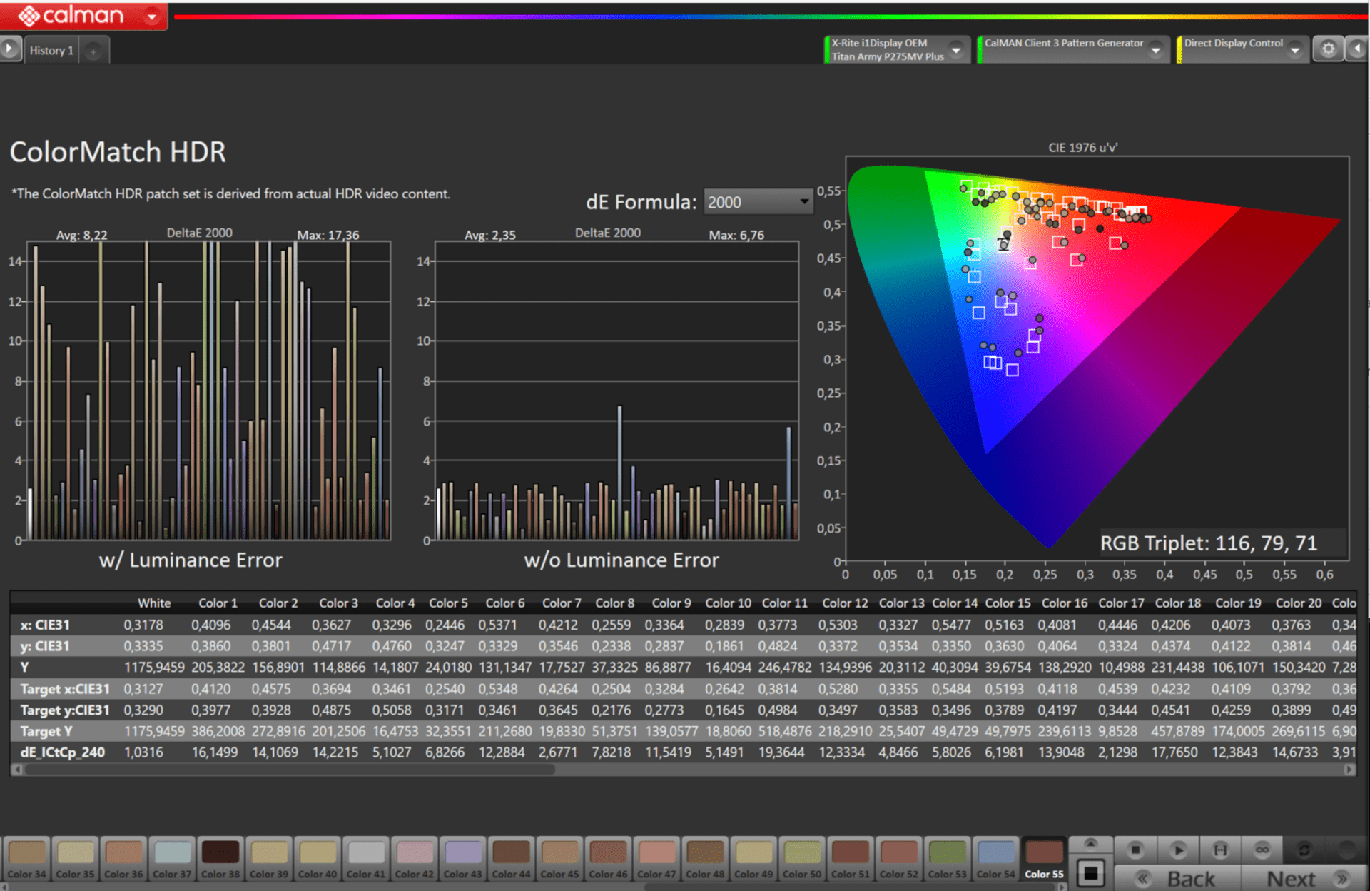 Das zeigt sich auch im Color-Match-Test. Ohne Luminanz-Fehler wird ein gutes gemitteltes DeltaE von 2,35 erreicht. Beziehen wir die Luminanz hingegen in die Messung ein, landen wir bei einem Wert von 8,22.