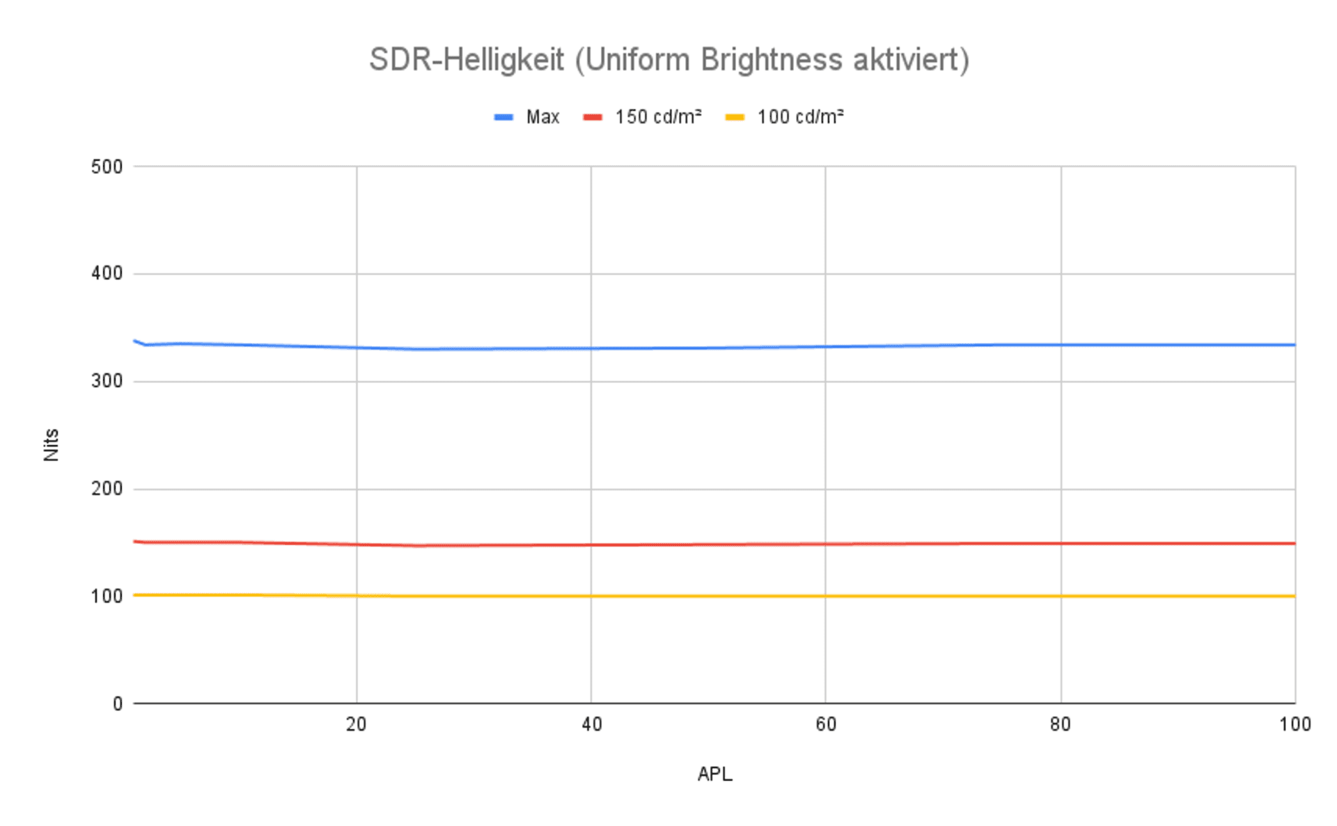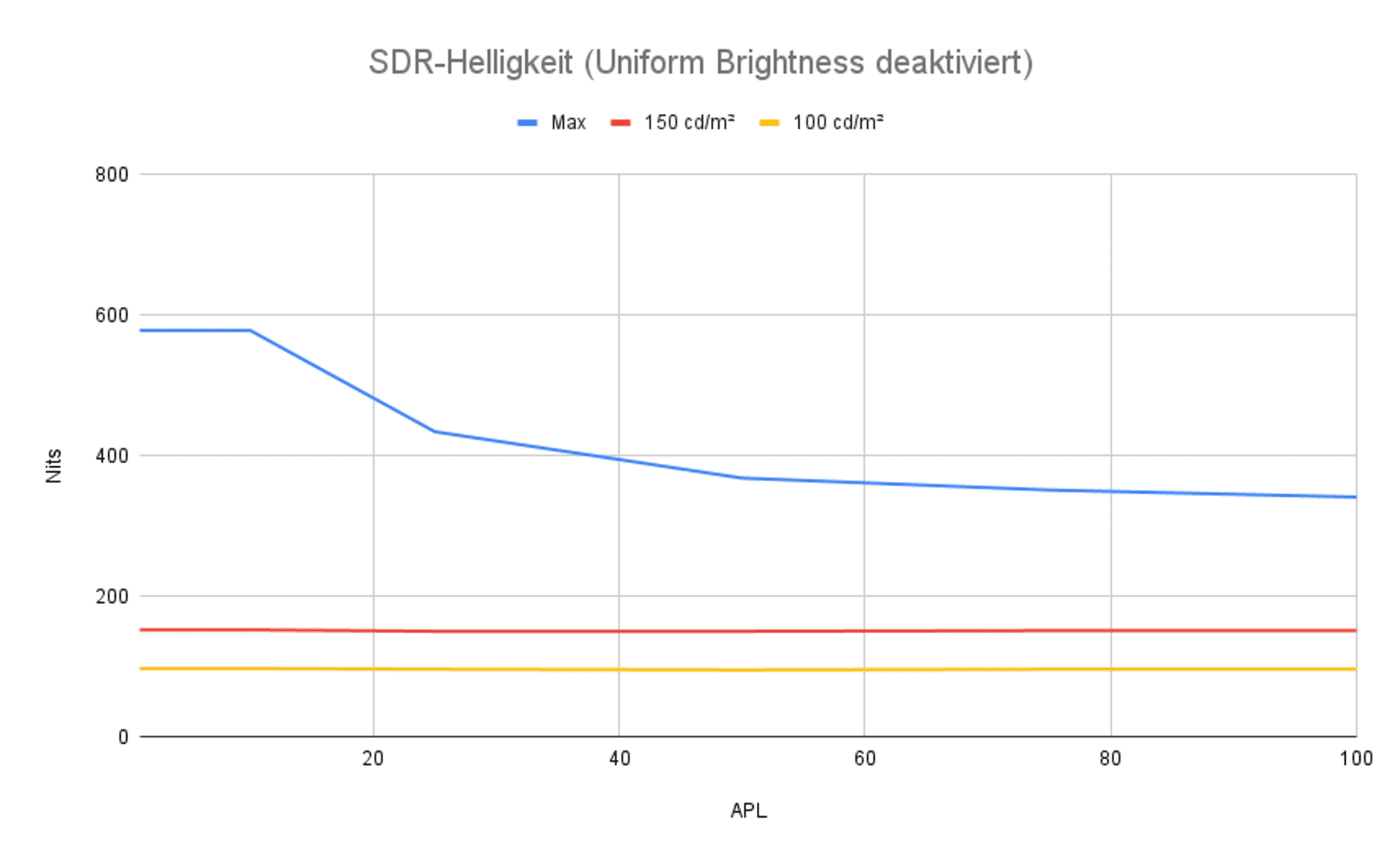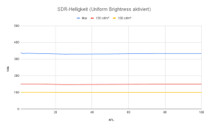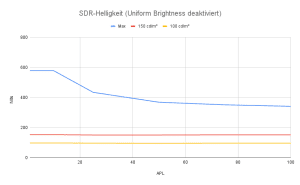 Mit aktivierter Uniform Brightness war das Testergebnis erwartbar. Die Helligkeit wird in allen drei Settings stabil über den gesamten APL-Bereich gehalten. Das sehen wir aktuell bei den meisten Geräten auf diese Weise.