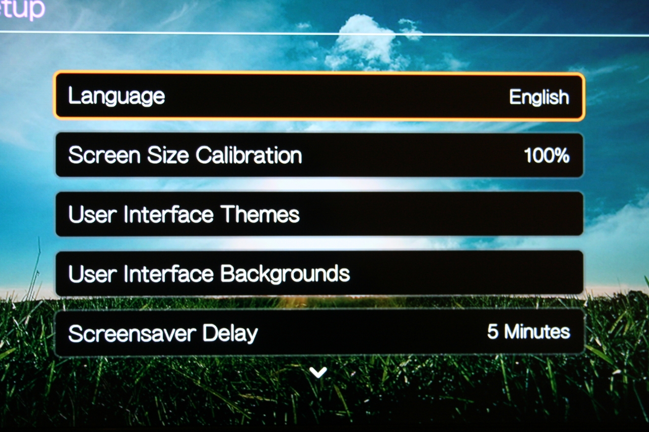 Die Menüführung hat WD deutlich sichtbar umgebaut, hier kommt ein auf den Namen "Moochi" getauftes UI zum Einsatz. Die ehemals zentrierte Listenstruktur musste einer Kombination aus flacher Basisschiene mit zentralen Elementen weichen. Als Zusatz hat das Menü auch eine Zeit- und Wetteranzeige nebst insgesamt deutlich mehr Funktionalitäten bekommen. Hintergrundbilder können sich nun anhand vorhandener Fotos selbst setzen lassen, genau wie sog. „Themes“ eine individuelle Anpassung der Oberfläche ermöglichen. Das Menü wirkt in der Standardeinstellung etwas verspielt, was hauptsächlich an der Farbgebung und Flächengröße liegt.