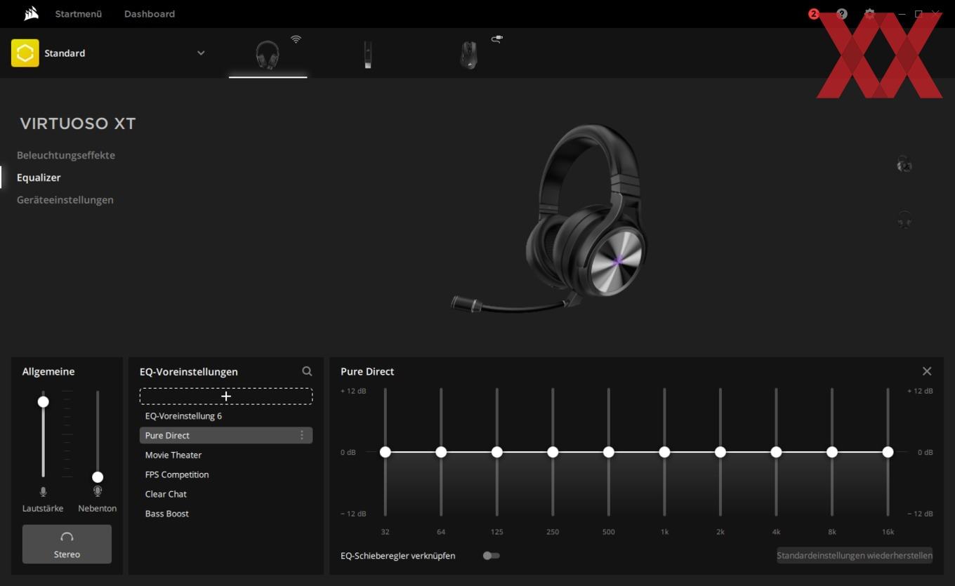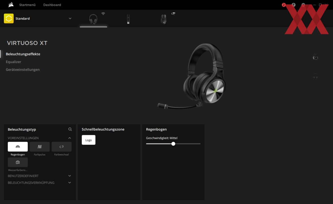 Fest mit fast jedem Corsair-Produkt ist iCue verbunden. Die Software-Suite bietet einen großen Funktionsumfang und erlaubt es, das Corsair-Ökosystem aufeinander abzustimmen. Das Virtuoso RGB Wireless XT erlaubt verschiedene Anpassungen. So besteht grundlegend die Möglichkeit, die Optik anzupassen, was in diesem Fall durch die lediglich zwei vorhandenen RGB-Elemente etwas limitiert ist.