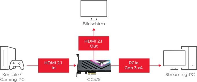 Der Hersteller liefert auf der Produktseite ein einfaches Piktogramm zur korrekten Verkabelung. Über den PCIe-Anschluss wird die Karte in den Rechner gesteckt. Das Eingangssignal kommt über HDMI von der Spielekonsole und wird sowohl an den PC, als auch, erneut via HDMI, an den Fernseher oder gewünschten Bildschirm zur Ausgabe weitergegeben.