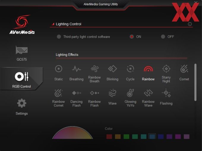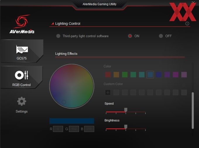 Man kann neben dem hauseigenen AVerMedia Gaming Utility Tool selbst auch Drittanbieter-Software nutzen, um die LEDs anzusteuern. Ein einfacher Wechsel der Einstellungen im System ermöglicht dies. Soll die Beleuchtung mit dem Tool selbst geregelt werden, lassen sich 15 verschiedene Effekte auswählen. Die Farben können im Farbkreis frei gewählt werden. Abschließend lassen sich Geschwindigkeit des Farbwechsels und Helligkeit einstellen.