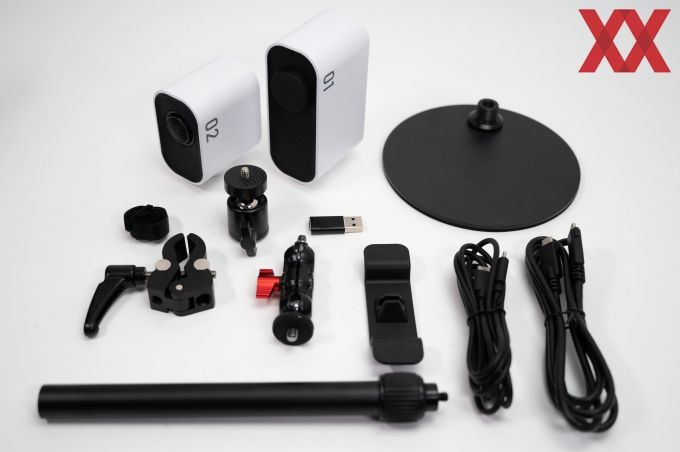Ausgeliefert wird alles, was zu einer direkten Verwendung notwendig ist in einem Schwarzen Karton, bei dem sich nur auf der Vorderseite eine Abbildung der beiden Kamers befindet. Features oder weitere Details zum Project Watcher befinden sich nicht auf der äußeren Verpackung. Im Inneren befinden sich dann die beiden Kameras, eine Fernbedienung, ein Standfuß mit einer Teleskopstange, ein USB-C-Anschluss- und ein Verbindungskabel, ein Kugelkopf für die erste Kamera sowie eine Klemme und ein kleiner Arm für die zweite Kamera.