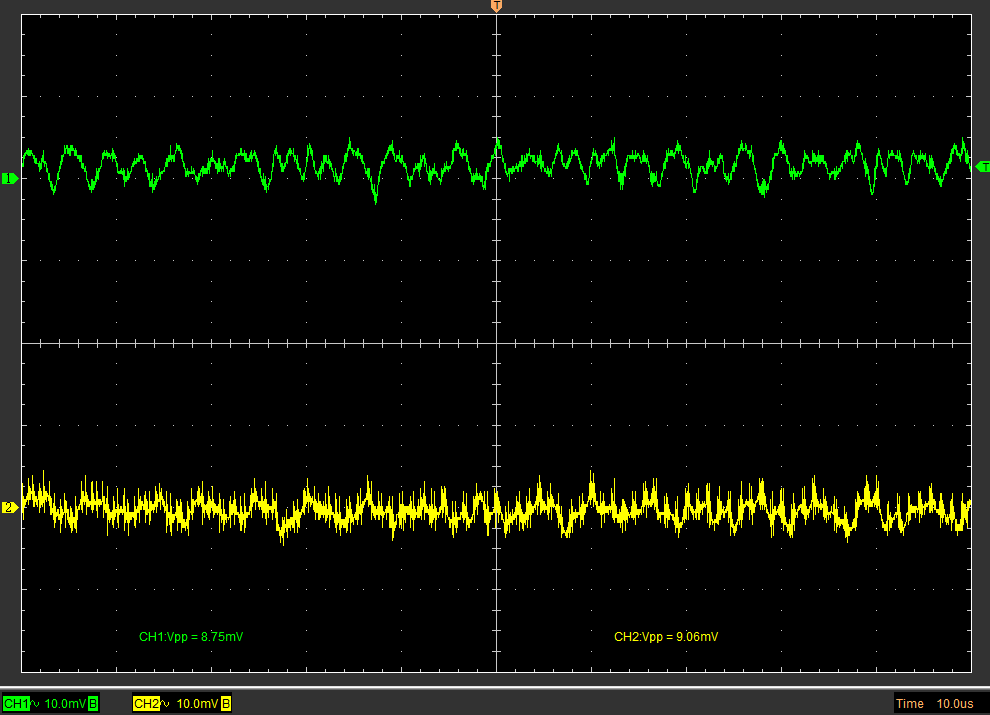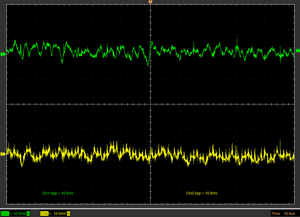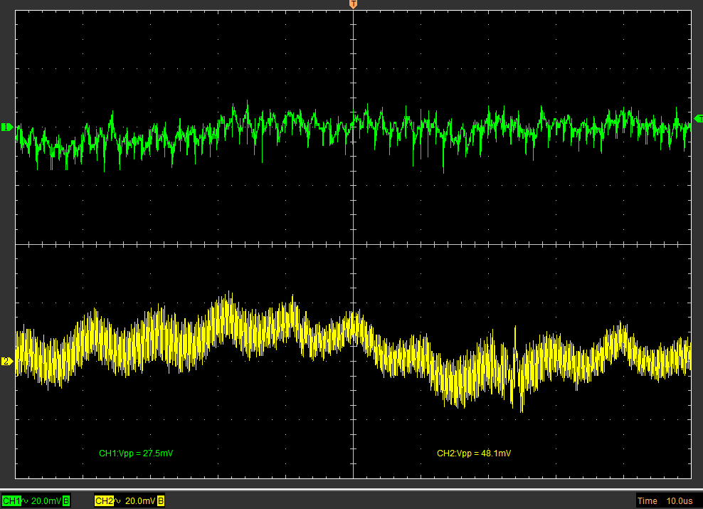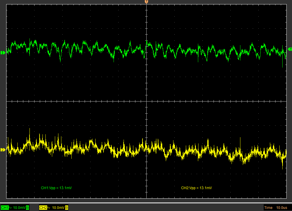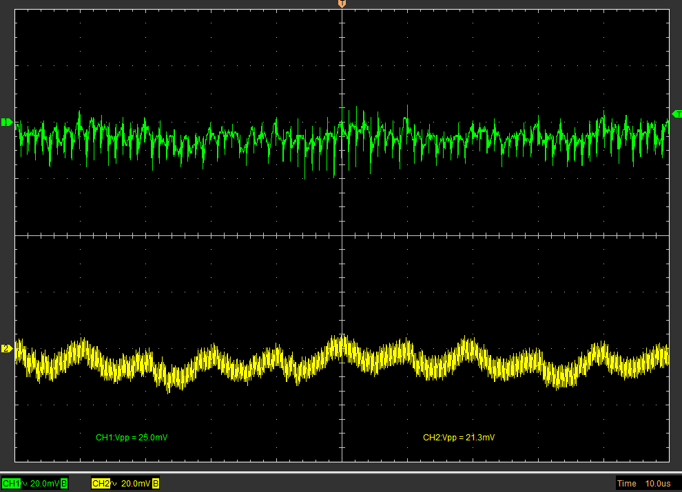 An den beiden 12V-Messpunkten liegen die Werte mit durchschnittlich unter 25 mV(pp) verglichen mit dem erlaubten Höchstwert von 120 mV(pp) auf einem sehr niedrigen Niveau, zumindest im Idle und mit der zusätzlichen 50A-Last auf 12 Volt. Im Prime95-Betrieb zeigen sich an 12V2 (CPU-Stromversorgung) etwas größere Schwankungen, aber auch diese bleiben mit ca. 40 mV(pp) im niedrigen Bereich.