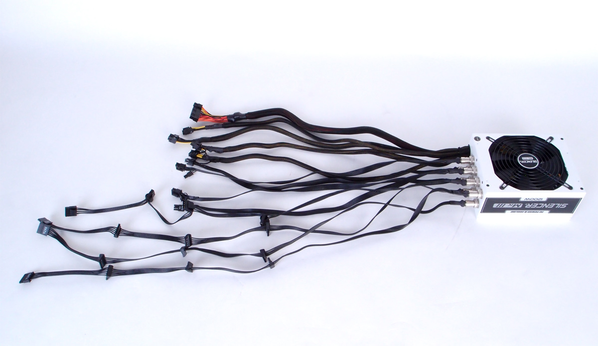 Das PPCMK3S1200 bringt der Klasse entsprechend gute Anschlussmöglichkeiten mit. Mit bis zu sechs PCI-Express-Anschlüssen und zwei 8-Pin-CPU-Versorgungssteckern lassen sich im Zusammenspiel mit 1200 Watt auch anspruchsvollere Multi-GPU-Systeme versorgen. Manches Konkurrenzmodell bringt zwar in diesem Leistungsbereich schon acht PCI-Express-Anschlüsse mit, aber die sechs des PC Power & Cooling sollten in der Praxis genügen. Weiterhin lassen sich bis zu 15 Geräte mit SATA-Anschluss versorgen, für zunehmend aussterbende Geräte mit 4-Pin-Molex-Stecker stehen noch bis zu vier Anschlüsse bereit. 15 SATA-Abgriffe wirken zwar auf den ersten Blick reichlich, aber da meist nicht jeder Abgriff genutzt werden kann, ist dies durchaus noch eine sinnvolle Dimensionierung. Kabellängen sowie Verarbeitung gehen beim Silencer Mk III 1200W auch in Ordnung.