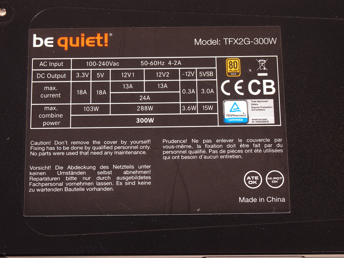 Die Kabellängen sind insgesamt ausreichend und dem Einsatzzweck angepasst. Auch die Verarbeitung kann sich sehen lassen. be quiet! gewährt auf die TFX Power 2 300W Gold8 zwei Jahre Herstellergarantie.
