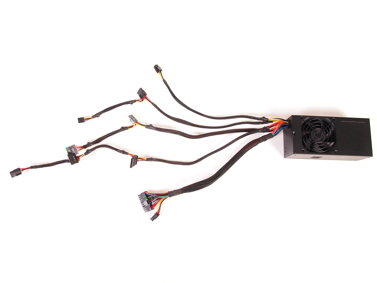 Die TFX Power 2 300W müssen auf ein modulares Kabelmanagement verzichten, daher präsentiert sich die Innenseite hier sehr aufgeräumt. Vorweggenommen sei hier einer der Nachteile des TFX Power 2 300W Gold, nämlich die Tatsache, dass kein PCI-Express-Stecker mit an Bord ist. Nur ein Adapter von zwei 4-Pin-Molex-Steckern auf eine 6-Pin-PCI-Express-Anschluss liegt bei.