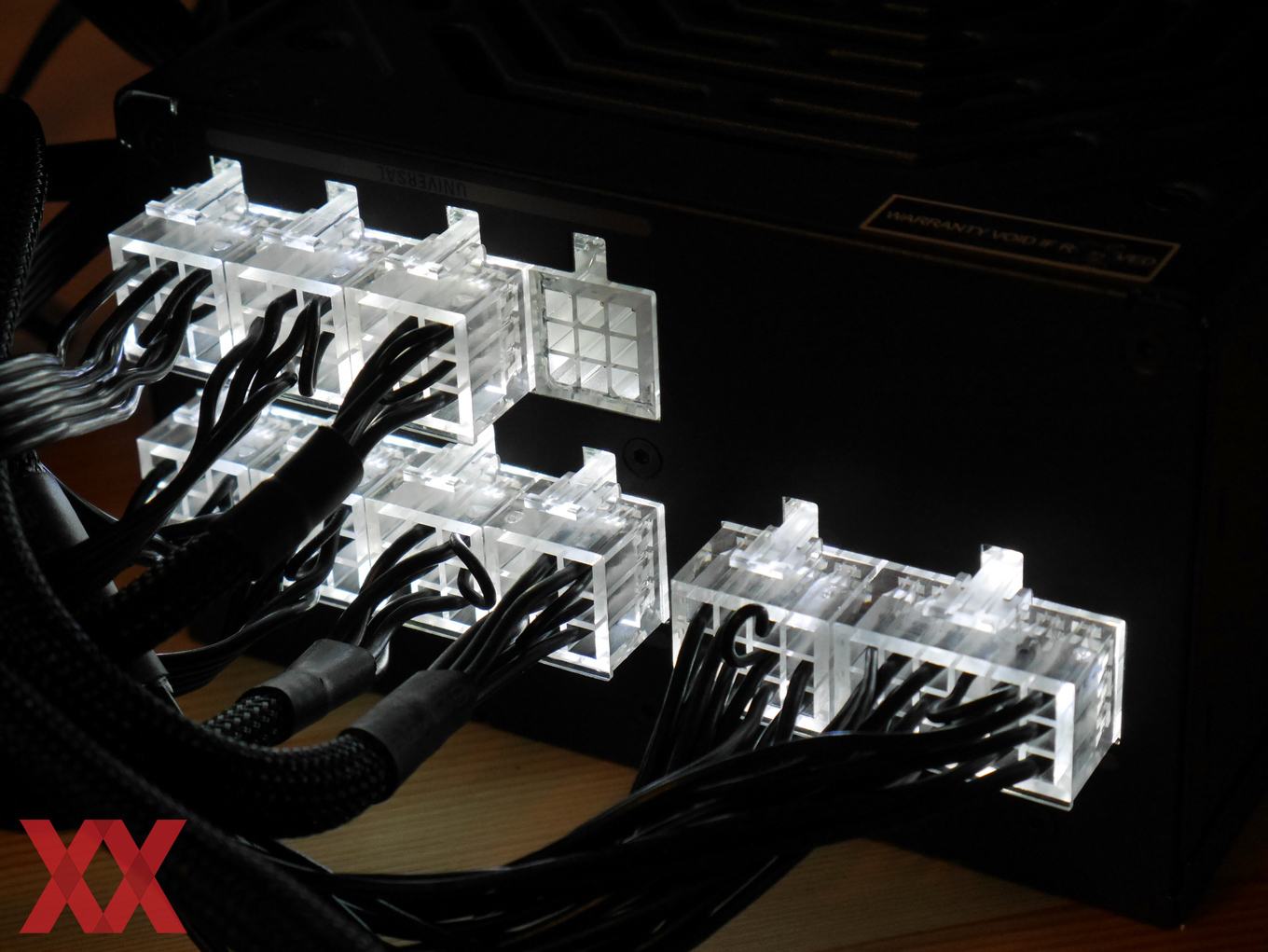 Buchsen und Stecker des Kabelmanagementsystems bestehen aus transparentem Kunststoff bzw. erinnern an Acrylglas. In den Buchsen sind weiße LEDs eingebaut, welche im Betrieb für eine elegante "innere" Beleuchtung sorgen, die sich bei Bedarf auch per außenliegendem Schalter deaktivieren lässt.