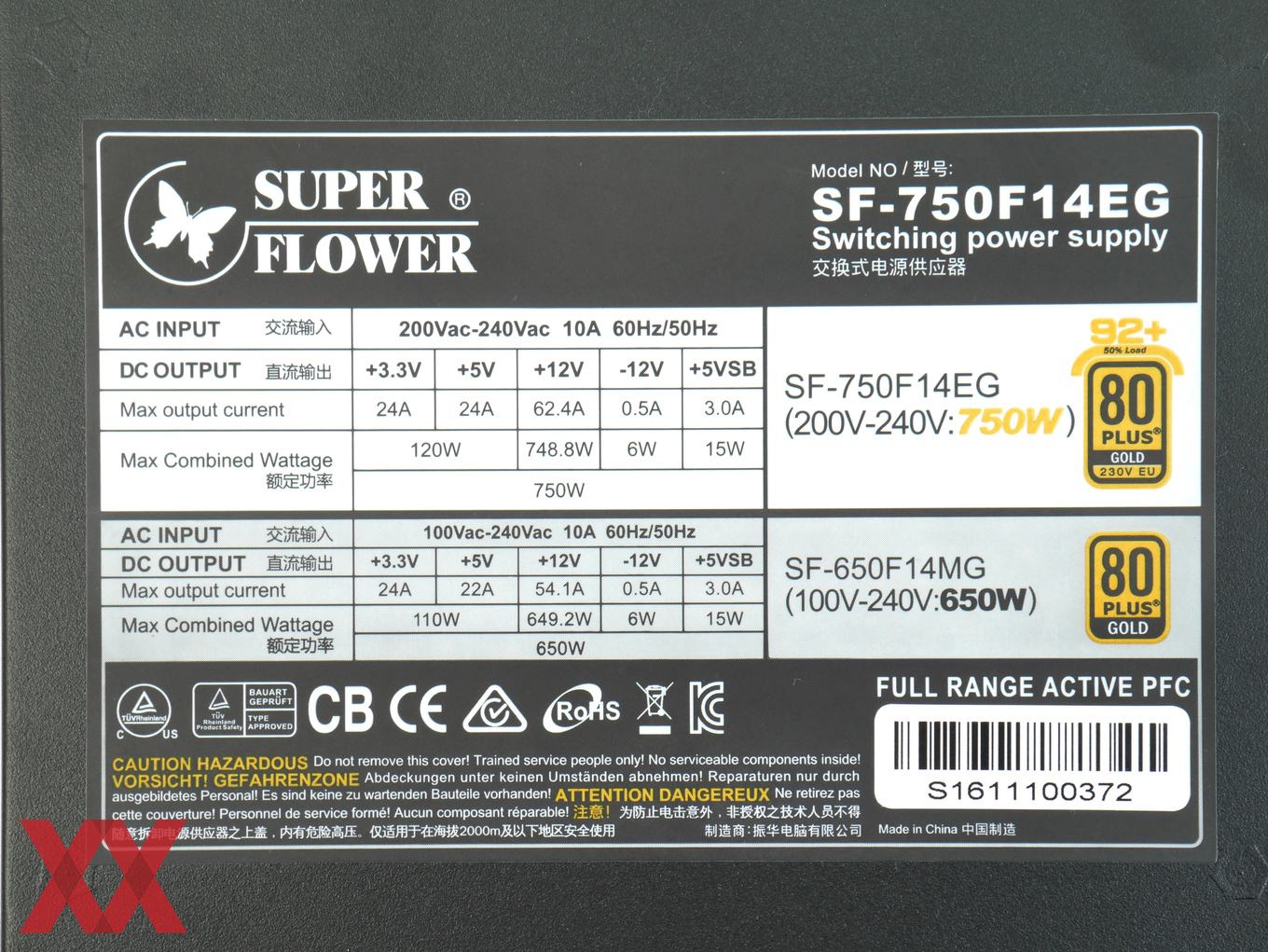 Die Besonderheit beim Super Flower Leadex II Gold 750W ist die doppelte Zertifizierung. Wird das Netzteil als 750W-Version betrieben, dann wird 80PLUS Gold unter 230V-Netzspannung erreicht, also nach in der "230V EU"-Variante. Wird Netzteil als 650W-Modell betrieben, dann erreicht es auch die klassischen 80PLUS Gold unter den dafür verwendeten 115-Volt-Netzspannung. Eventuell reicht als 750W-Netzteil betrieben die Effizienz bei Volllast unter 115V nicht mehr ganz für Gold aus, d.h. mit der Reduzierung auf 650 Watt erreicht man auf der hin zu hohen Lasten immer weiter abfallenden Wirkungsgradkurve schlichtweg einen höheren Punkt. Ein Blick in die Testergebnisse zeigt, dass zumindest unser Sample auch als 750W-Modell ohne Probleme die klassischen 80PLUS Gold unter 115 Volt erreicht hätte.