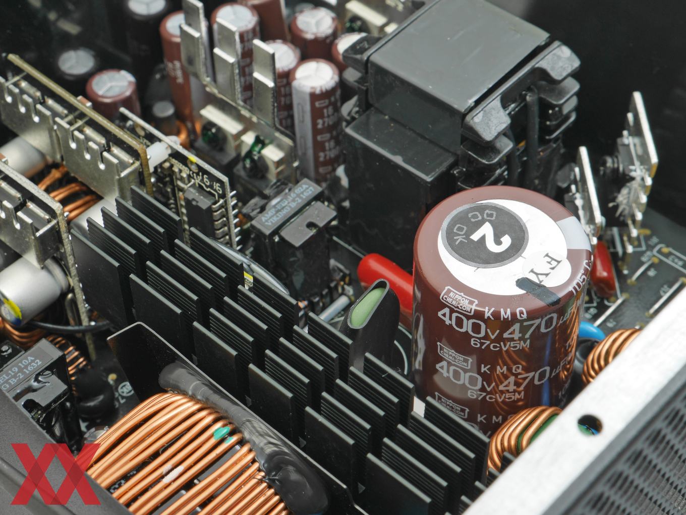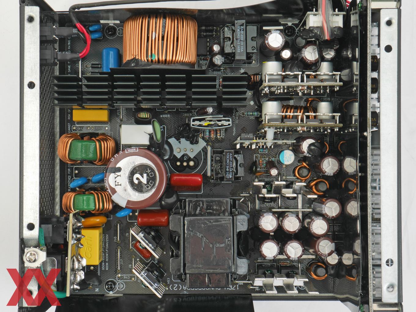 Im Inneren des Super Flower Leadex II Gold 750W arbeitet zeitgemäße Technik aus eigener Fertigung, welche im Vergleich zum Vorgänger eher auf kleinere Optimierungen setzt. Im Vergleich zur Leadex-Plattform des Vorgängermodells haben sich also nur einige Bauteilbestückungen verändert. Super Flower spricht selbst u.a. von einer Optimierung des 230V-Betriebs. Die Technik der Leadex-Plattform mit LLC-Resonanzwandler und DC-DC-Wandlern ist nach wie vor modern und konnte in der Vergangenheit stets überzeugen. Bei der Bauteilwahl hat Super Flower nicht gespart und setzt bei den Elkos durchgänging auf Modelle von Nippon Chemicon. Primärseitig kommt ein Modell mit 470-uF-Kapazität und 400-V-Spannungsfestigkeit zum Einsatz, sekundärseitig sind es ebenfalls 105-°C-Modelle von Nippon Chemicon und einige Feststoff-Kondensatoren.