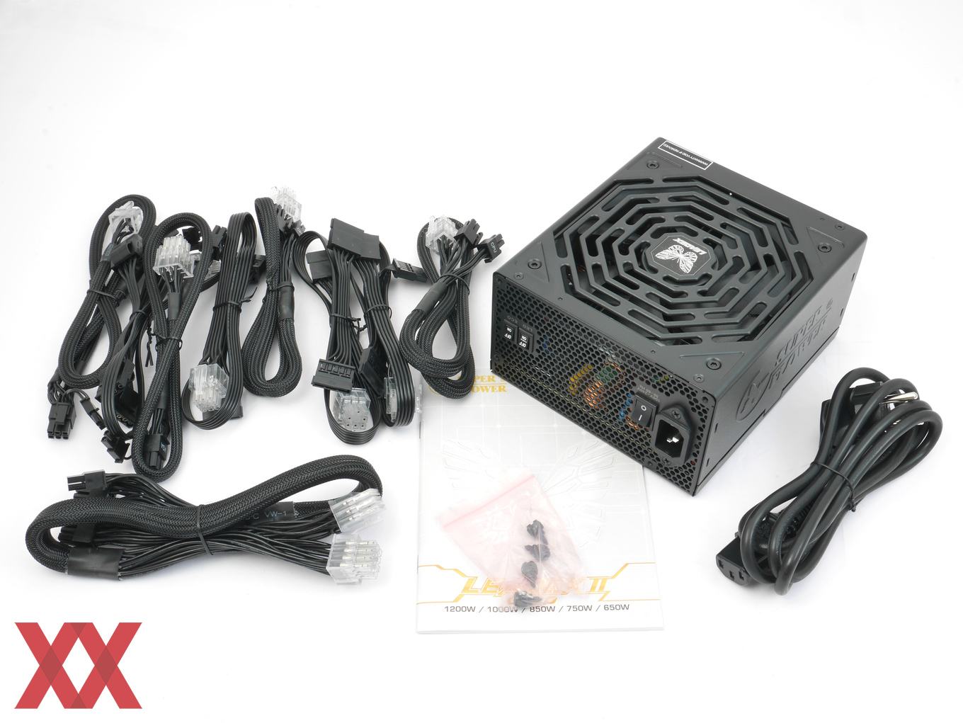 Der Lieferumfang des Super Flower Leadex II Gold 750W ist vergleichsweise vollständig. Neben den modularen Anschlusskabeln, dem Netzkabel und den Montageschrauben gibt es noch ein kleines mehrsprachiges Handbuch dazu. Im Handbuch werden sowohl alle wesentlichen technischen Daten aufgeführt als auch allgemeine und spezielle Informationen, z.B. zu der umschaltbaren Lüftersteuerung.