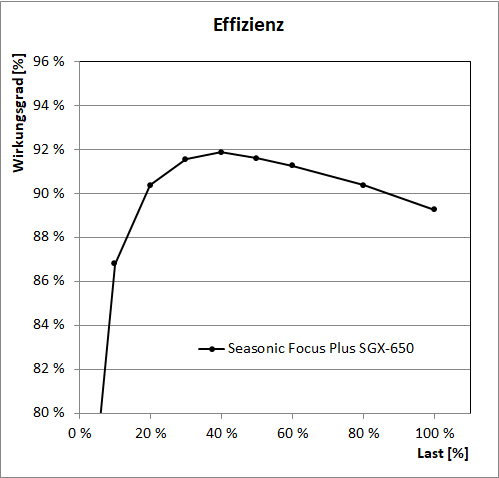 Bei zehn Prozent Last werden dann bereits 86,8 % erreicht, was ebenfalls einen brauchbaren Wert darstellt. Bei 20 % liegt der Wirkungsgrad bei guten 90,4 %, wobei er mit zunehmender Last dann noch weiter ansteigt. Das Wirkungsgradmaximum erreicht das Seasonic Focus SGX-650 im Bereich von 30 bis 60 % an Last, wo es Werte größer 91 % erreicht. Der von uns gemessene Maximalwert liegt bei 91,9 % bei einer Last von 40 %. Mit steigender Last beginnt der Wirkungsgrad dann langsam abzusinken und erreicht bei 80-%-Last noch solide 90,4 %. Das gute Bild wird mit 89,3 % Wirkungsgrad unter Volllast dann komplettiert.