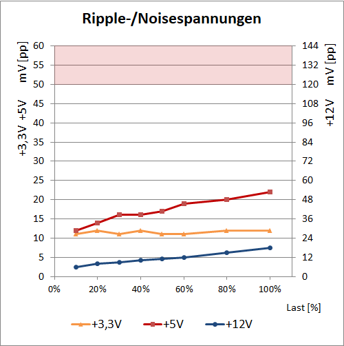 Weiterhin schauen wir uns die Qualität der Ausgangsspannungen per Oszilloskop im Detail an. Die so genannten Ripple-/Noisespannungen sind hochfrequente Wechselspannungen, die auf die eigentliche Ausgangs-Gleichspannung aufgeprägt sind. Sie entstehen durch die Arbeitsweise von Schaltnetzteilen und werden je nach Güte des Netzteildesigns bzw. seiner Ausgangsfilter mehr oder weniger stark herausgefiltert. Im ATX Design Guide ist festgelegt, dass auf 12 Volt Werte von 120 mV (pp, "peak-to-peak"), bei 3,3 Volt und 5 Volt 50 mV (pp) auftreten dürfen.