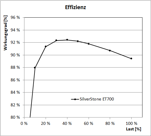 Im Bereich Effizienz lässt sich zum SilverStone ET700-MG eigentlich nur sagen, dass es eine durchschnittliche - im Sinne von "unauffällige" - 80-PLUS-Gold-Effizienz mitbringt, ohne besondere Höhen und Tiefen.