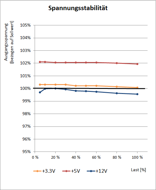 Die Qualität der Ausgangsspannungen ist eines der wichtigsten Merkmale eines Netzteils, eigentlich noch deutlich wichtiger als seine Effizienz. Arbeitet ein Netzteil nicht stabil bzw. liefert stark schwankende Spannungen, kann die Funktion des Rechners beeinträchtigt werden. Wir schauen uns daher einmal an, wie sich die Spannungen unter Last verändern und ob sie im durch den ATX Design Guide festgelegten Toleranzbereich bleiben. Dieser erlaubt Abweichungen von +/- 5 % von der Sollspannung, der Wertebereich der Diagramme entspricht genau diesem Toleranzbereich.