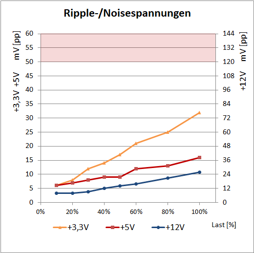 Bei den Ripple-/Noisespannungen sieht die Lage hingegen nur durchschnittlich gut aus. Mit bis zu 32 mV(pp) bzw. 16 mV(pp) werden auf den Nebenspannungen Werte erreicht, die zwar sicher im erlaubten Toleranzbereich liegen, aber mit denen das Polaris 1050W auch keine Preise gewinne kann. Die 26 mV(pp) auf 12 V hingegen sind dann wieder als gut zu bezeichnen.