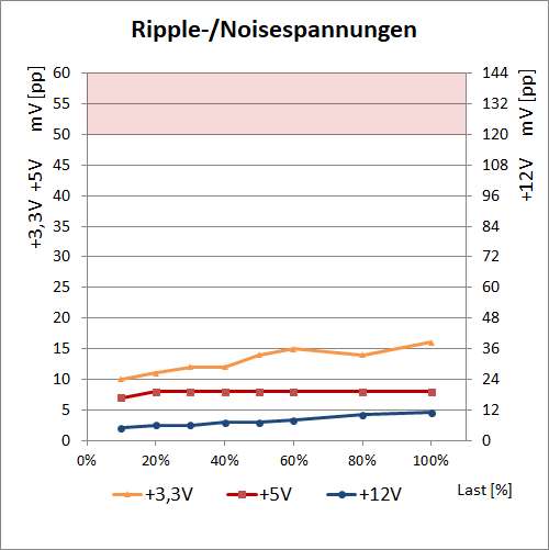 Für den Bereich der Ausgangsspannungen kann das Antec Signature Titanium 1000W den erwarteten sehr guten Eindruck hinterlassen. Die sehr stabilen Ausgangsspannungen liegen solide mitten im Toleranzfeld und die Ripple-/Noisespannungen sind ebenfalls im niedrigen Bereich. Verglichen mit dem AX1000 und dem Prime Titanium 1000W kann das Antec keine neuen Bestwerte setzen, aber insgesamt gut mithalten und sich als technisch gleichwertig präsentieren.