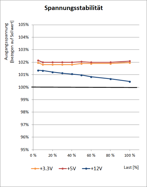 Die Qualität der Ausgangsspannungen ist eines der wichtigsten Merkmale eines Netzteils, eigentlich noch deutlich wichtiger als seine Effizienz. Arbeitet ein Netzteil nicht stabil bzw. liefert stark schwankende Spannungen, kann die Funktion des Rechners beeinträchtigt werden. Wir schauen uns daher einmal an, wie sich die Spannungen unter Last verändern und ob sie im durch den ATX Design Guide festgelegten Toleranzbereich bleiben. Dieser erlaubt Abweichungen von +/- 5 % von der Sollspannung, der Wertebereich der Diagramme entspricht genau diesem Toleranzbereich.