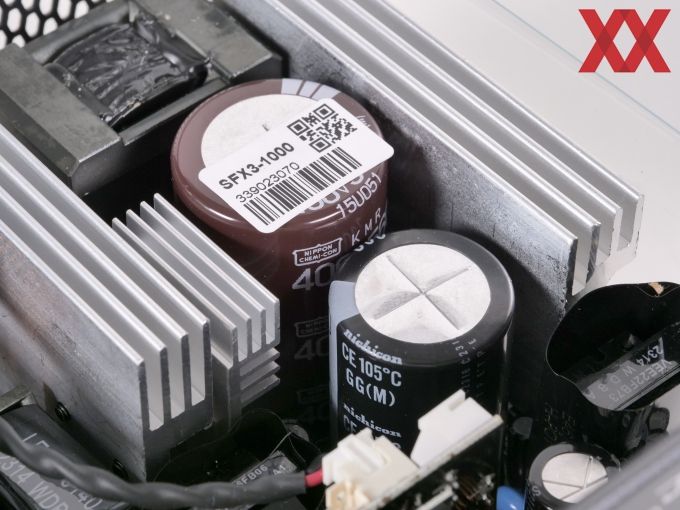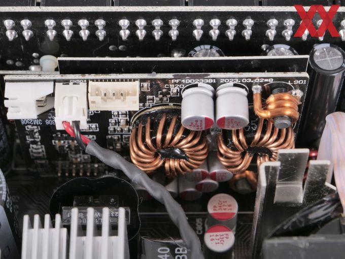 Im Eingangsbereich des Seasonic FOCUS GX-1000 ATX 3.0 sind zwei Elektrolytkondensatoren von hochwertigen japanischen Marken zu finden. Ein Modell stammt aus dem Regal von Nippon Chemicon und ist mit einer Kapazität von 560 uF und einer Spannungsfestigkeit von 400 V spezifiziert. Der zweite Elko mit 330 uF und 400 V wurde von Nichicon produziert. Sekundärseitig stammen die Elkos aus den Regalen von Nippon Nichicon und Rubycon.