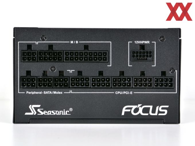 Das Anschlussfeld des voll-modularen Kabelmanagements wurde beim FOCUS GX-1000 ATX 3.0 überarbeitet. So ist die Buchse für das Kabel mit 12VHPWR-Stecker neu hinzugekommen und die Anordnung der Buchsen insgesamt wurde angepasst. Neu ist auch die optische Markierung der Anschlüsse durch aufgedruckte weiße Linien. Die Anzahl der Anschlussbuchsen mit fünf achtpoligen für CPU/PCI-Express-Kabeln und vier sechspoligen für Peripheriegeräte ist identisch zum Vorgängermodell geblieben.