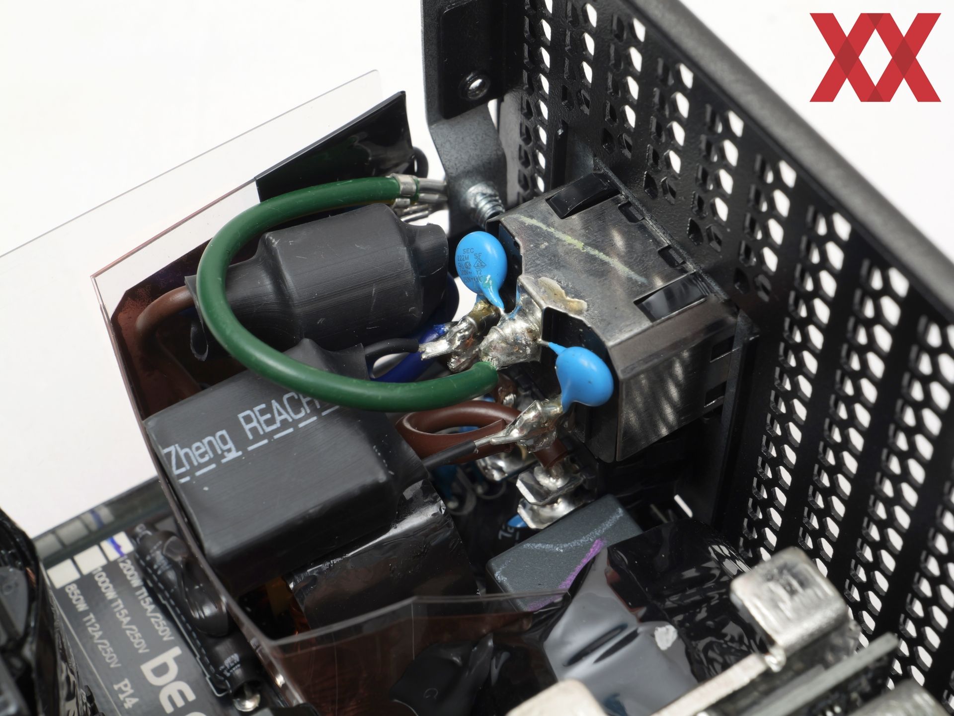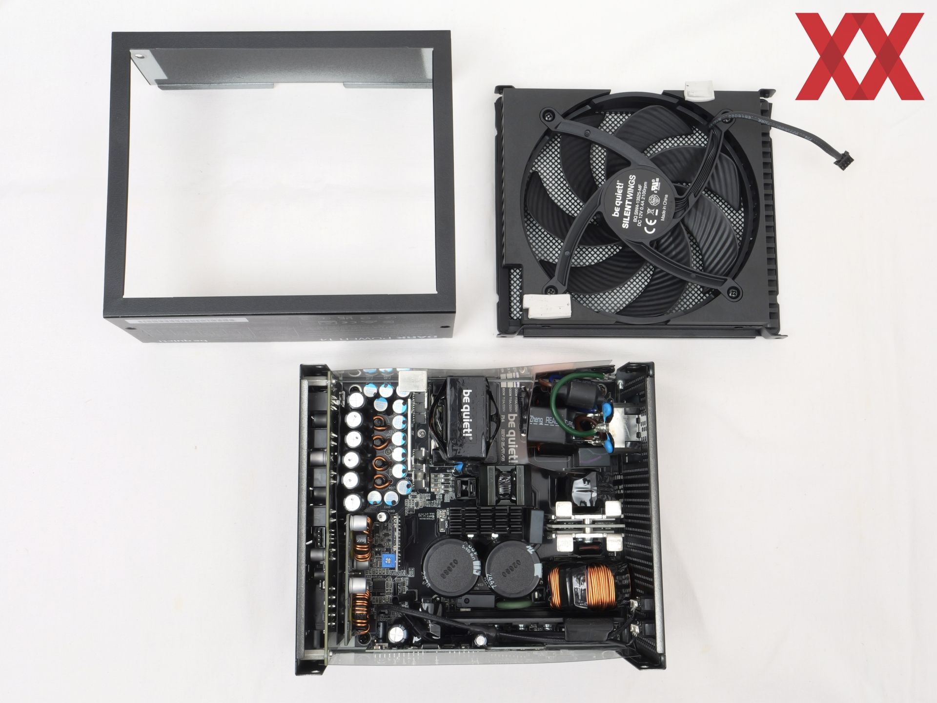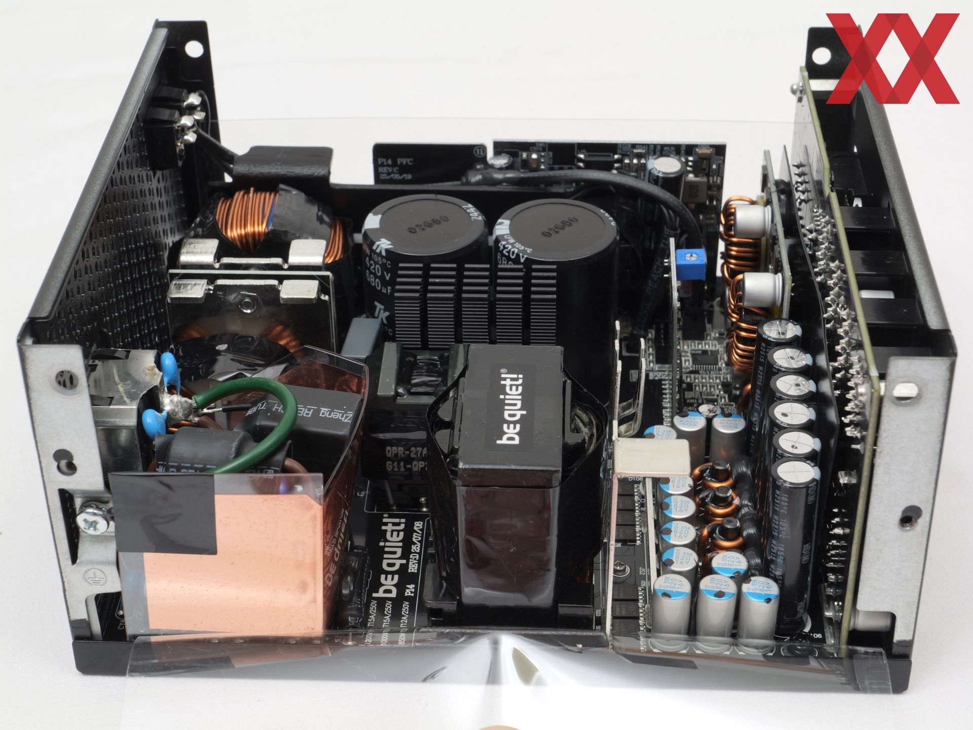 Bei den Dark-Power-14-Serie kommt nun eine zwischen Aktiv- und Semi-Passiv-Modus umschaltbare Lüftersteuerung zum Einsatz. be quiet! gibt sich damit aber nicht zufrieden und hat in den Deckelbereich des Netzteils um den Lüfter herum einen großen Kühlkörper integriert, welcher über Wärmeleitpads mit einigen Bauteilen der Leistungselektronik verbunden ist. Das verbessert die Kühlung dieser Bauteile sowohl im aktiven als auch semi-passiven Betrieb.