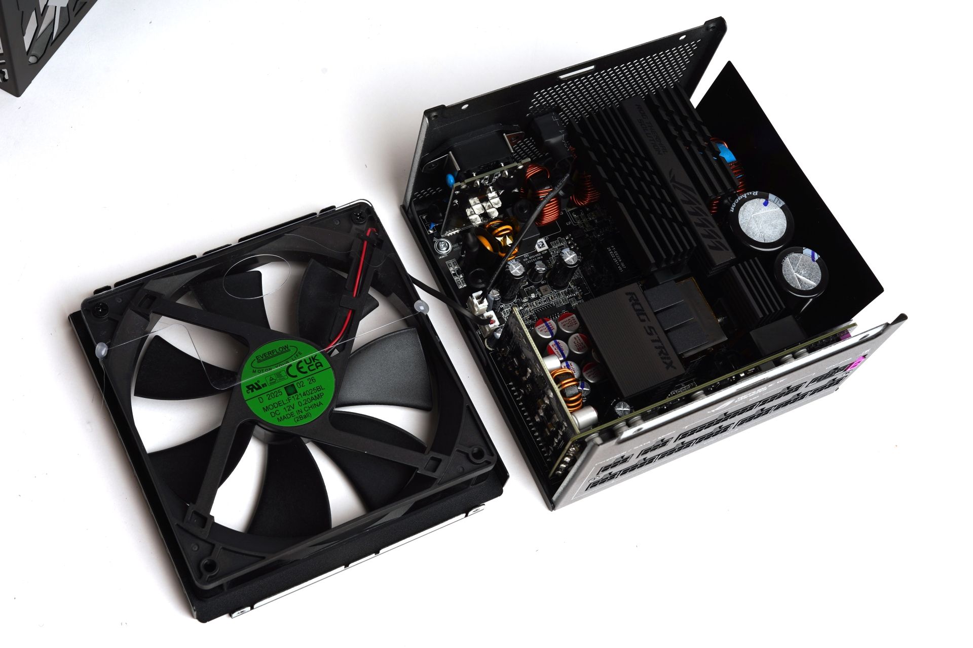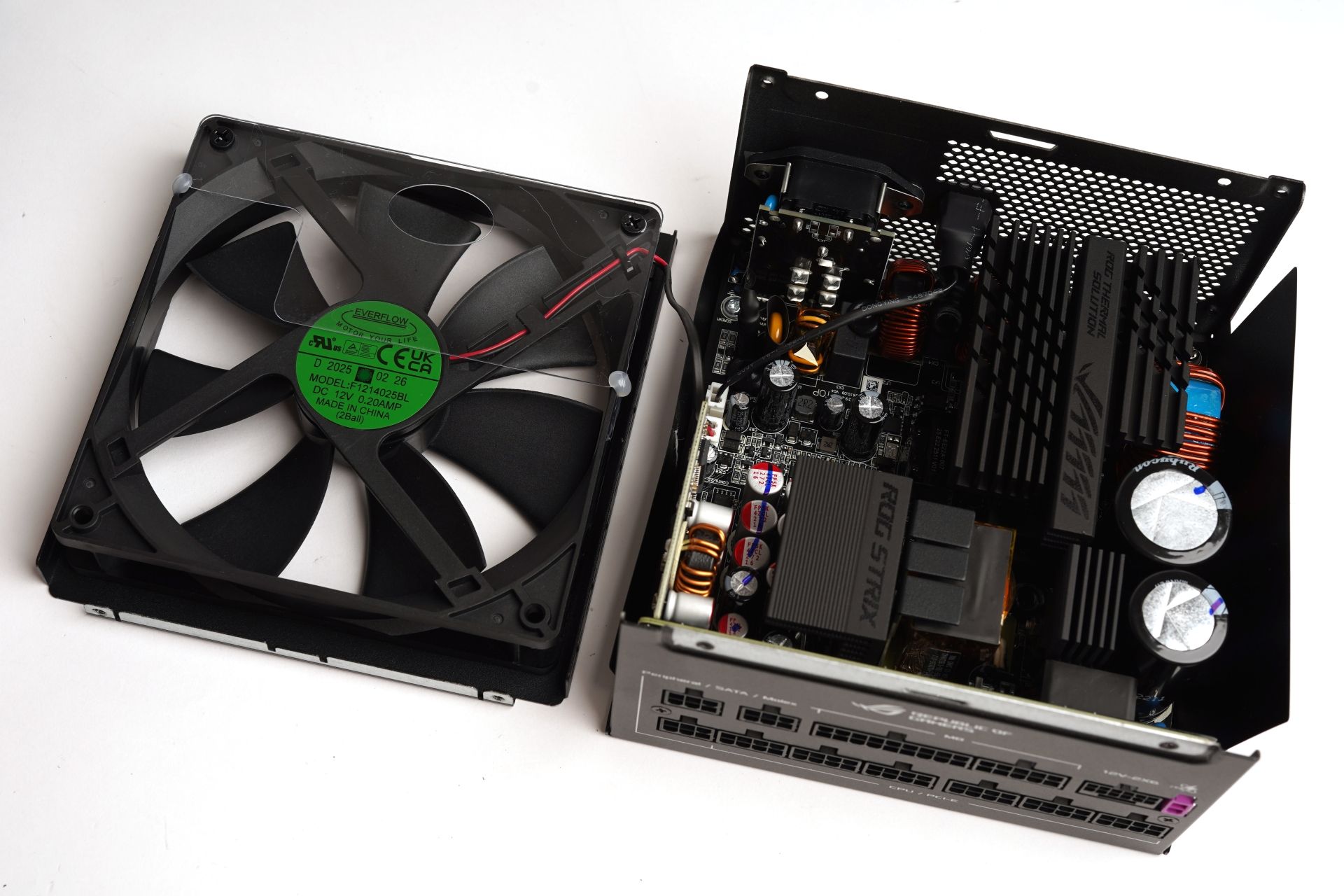 Beginnen wir wie immer mit der Lautstärke: Der kugelgelagerte 135-mm-Lüfter stammt von Everflow (F1214025BL), man hat sich hier also für ein langlebiges Modell entschieden, was für Netzteile durchaus üblich ist. Im semi-passiven Modus funktioniert die Abschaltung unter geringer Last sauber, anfangs hat das Modell sehr niedrige Drehzahlen von unter 400 U/min. Hier ist nur ein minimales, bauartbedingtes Lagergeräusch wahrnehmbar. Erst ab 900 W wird das Modell hörbar - wobei man sicherlich die Drehzahlen bei dem großen Kühlkörper hätte auch noch niedriger einstellen können. ASUS ist hier also recht konservativ unterwegs und hat hinsichtlich der Temperaturen viel Spielraum. Richtig laut wird der Lüfter auch bei 1.250 U/min noch nicht.