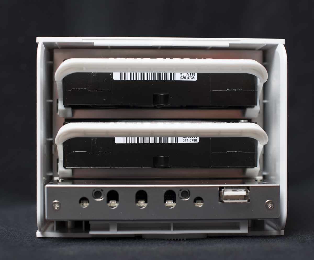 Gekühlt wird das System von einem kleinen 40 mm-Lüfter im Heck, der damit offensichtlich ein wenig überfordert ist. Der kleine Lüfter erzeugt eine erstaunliche Geräuschkulisse, die sogar die internen Platten übertönt. Hier hätte ein größerer Lüfter gut getan, Platz dafür wäre genug gewesen. Neben dem Lüfter gibt es wie schon erwähnt die Vibrationen der Festplatten, die das kleine Gehäuse nicht abzudämpfen vermag.