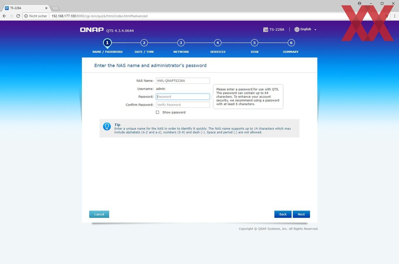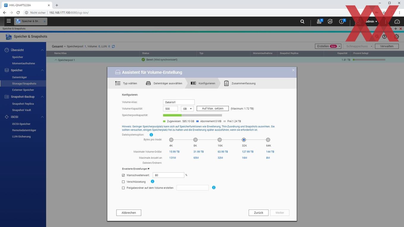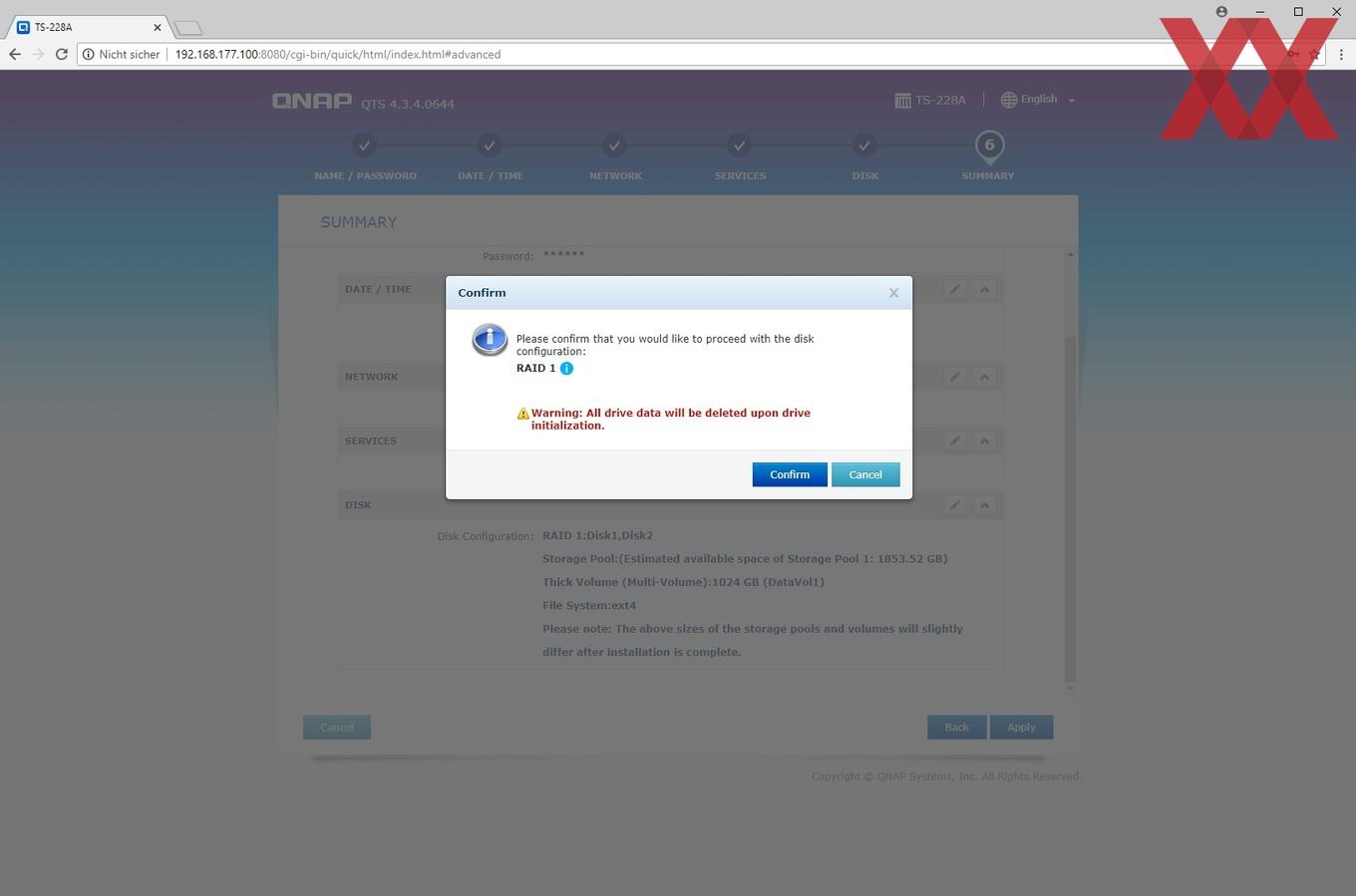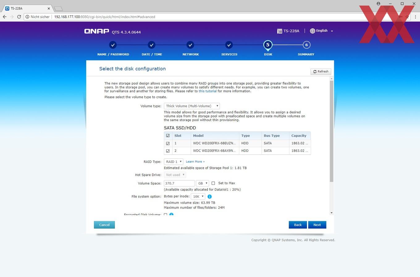 Bei der Installation wird ein Admin-Account eingerichtet, die Zeiteinstellung gesetzt, die IP-Konfiguration überprüft und zu guter Letzt noch das Speichervolumen angelegt.