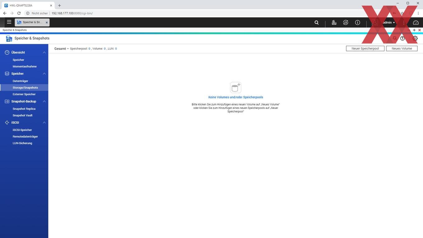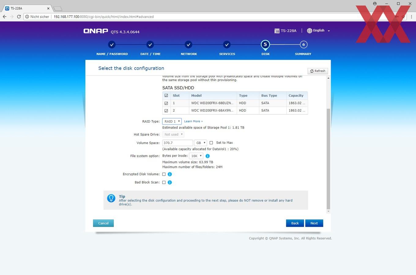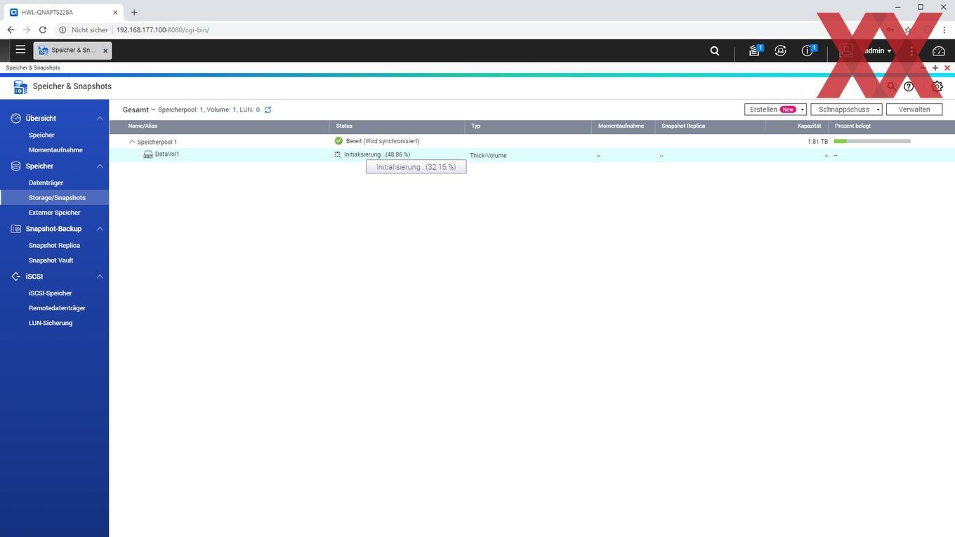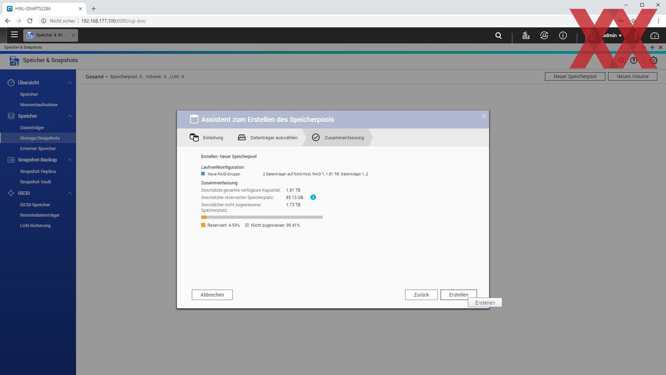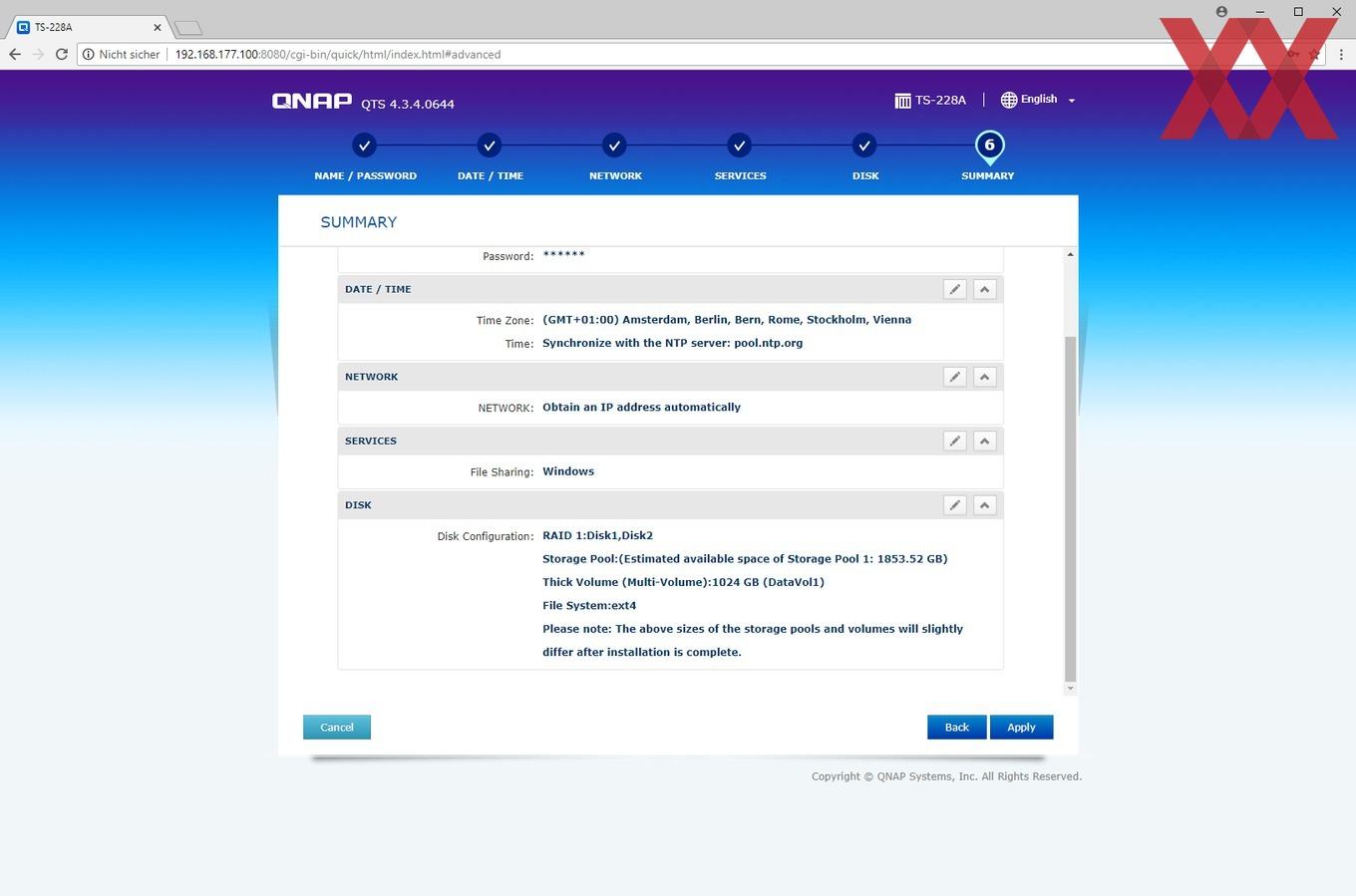 Bei der Installation wird ein Admin-Account eingerichtet, die Zeiteinstellung gesetzt, die IP-Konfiguration überprüft und zu guter Letzt noch das Speichervolumen angelegt.