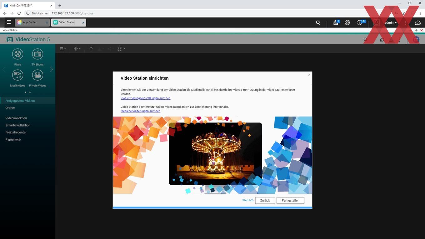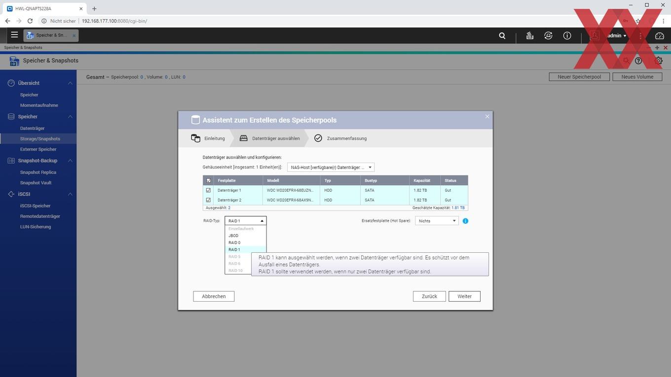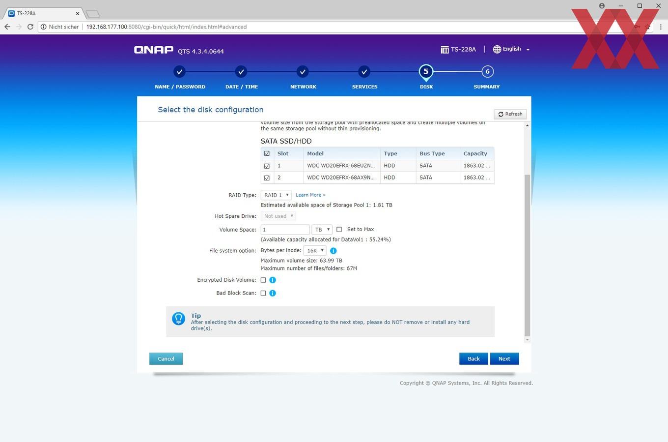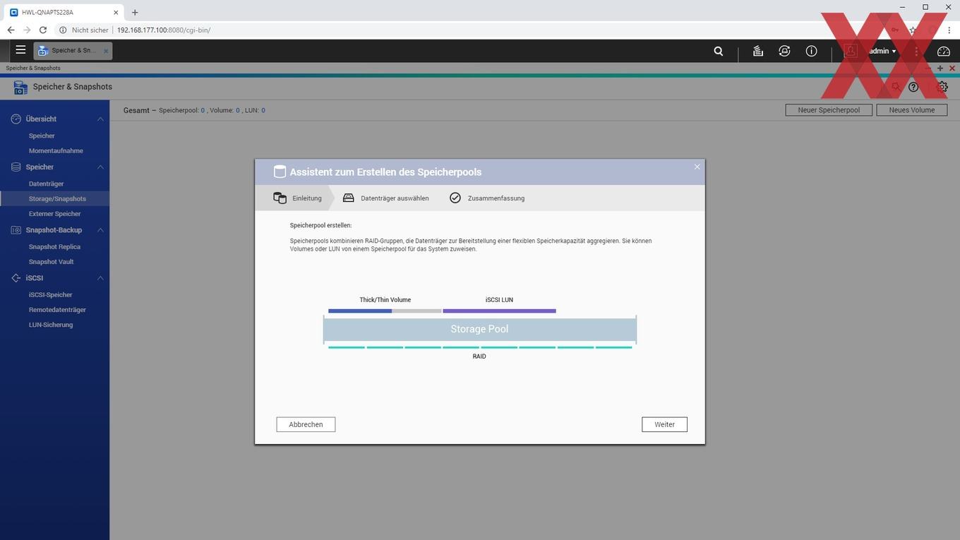 Bei der Installation wird ein Admin-Account eingerichtet, die Zeiteinstellung gesetzt, die IP-Konfiguration überprüft und zu guter Letzt noch das Speichervolumen angelegt.