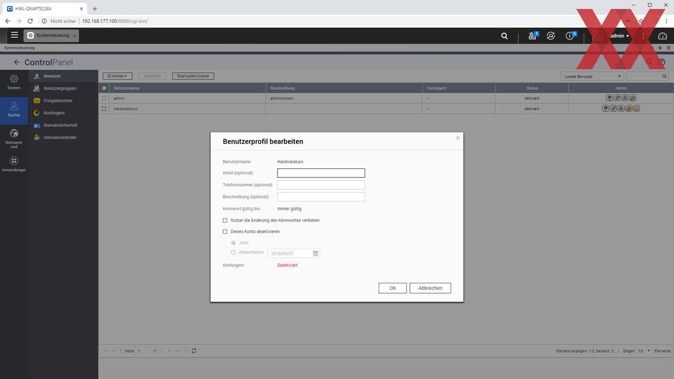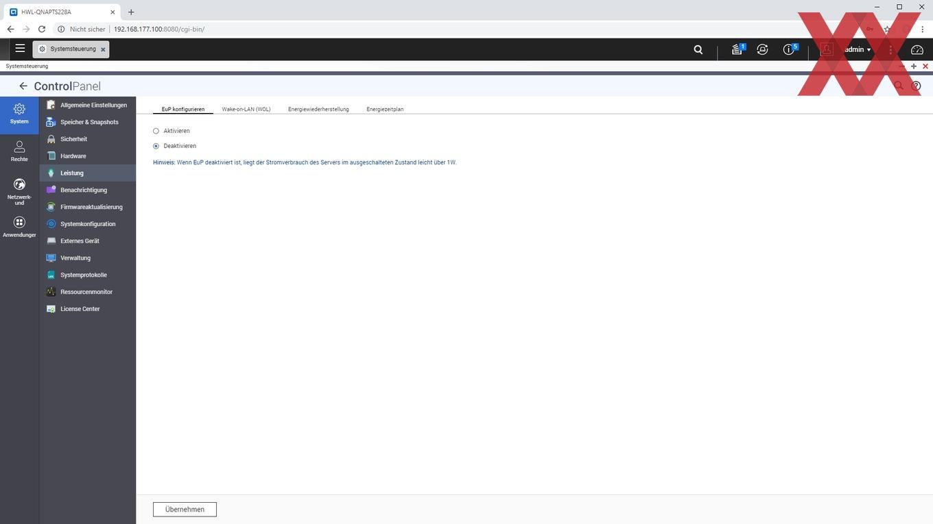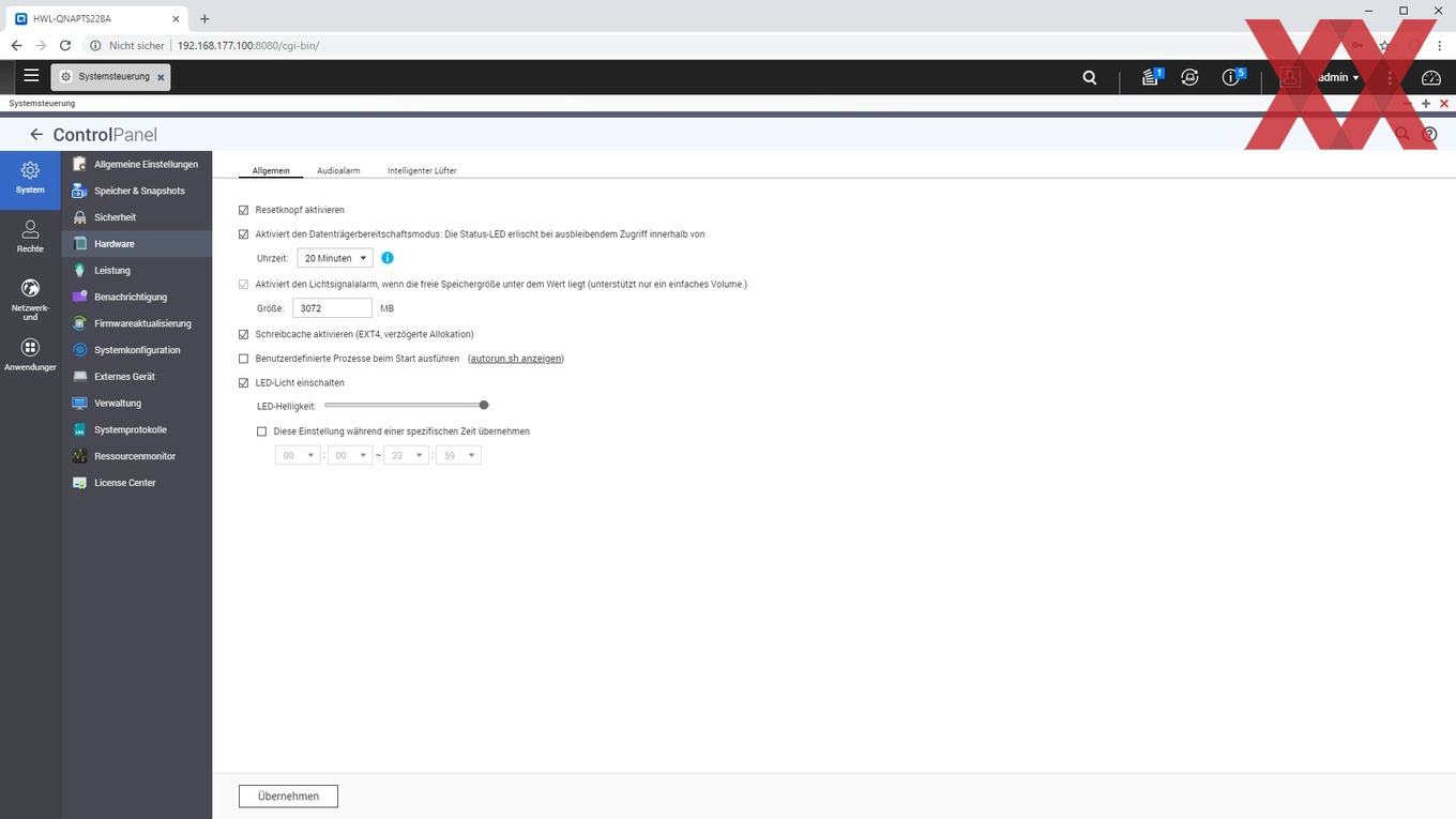 Im Bereich "Hardware" der Systemsteuerung lässt sich noch ein Ruhemodus für die Laufwerke aktivieren, der dann nach einer einstellbaren Zeitspanne (5 min bis 1h) die Laufwerke herunterfährt, sofern keine Zugriffe auf sie stattgefunden haben. Das TS-228A unterstützt Wake-on-Lan und zeitgesteuertes Hoch- und Herunterfahren, aber kein Standby des Systems. Weiterhin lässt sich - ebenfalls wahlweise auch zeitgesteuert - noch die Helligkeit der Status-LEDs einstellen, der Alarmsummer abschalten und die Lüftersteuerung konfigurieren. Per Default arbeitet sie automatisch, aber sie lässt sich auch entweder manuell auf drei unterschiedliche konstante Lüftergeschwindigkeiten einstellen oder für drei einstellbare Temperaturbereiche semi-automatisch konfigurieren. Alles in allem handelt es sich um eine recht intuitiv zu bedienende Oberfläche, die Synologys ähnlich konzipiertem Betriebssystem DSM (DiskStation Manager) nicht wirklich nachsteht.
